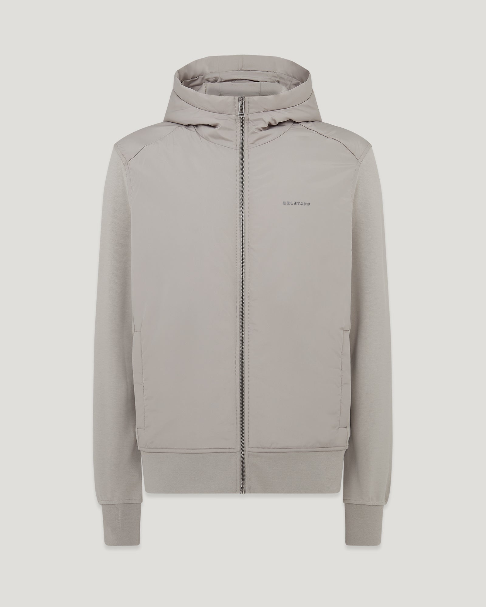 The Alloy zip through hoodie in Cement Grey is expertly crafted from compact, double-faced sweatshirt fabric with nylon panelling. It is accompanied by high thread count stretch cotton sleeves and trims and is finished with polished metal hardware. DETAILS - Cotton interlock jersey with polyester woven - Woven polyester front panel - Printed chest branding - BCI Cotton - Body: 100% Cotton, Filling: 100% Polyester, Woven: 100% Polyester - Rib: 98% Cotton, 2% Elastane - Product ref: 105239CMTGY SIZE AND FIT - Cut for a regular fit
