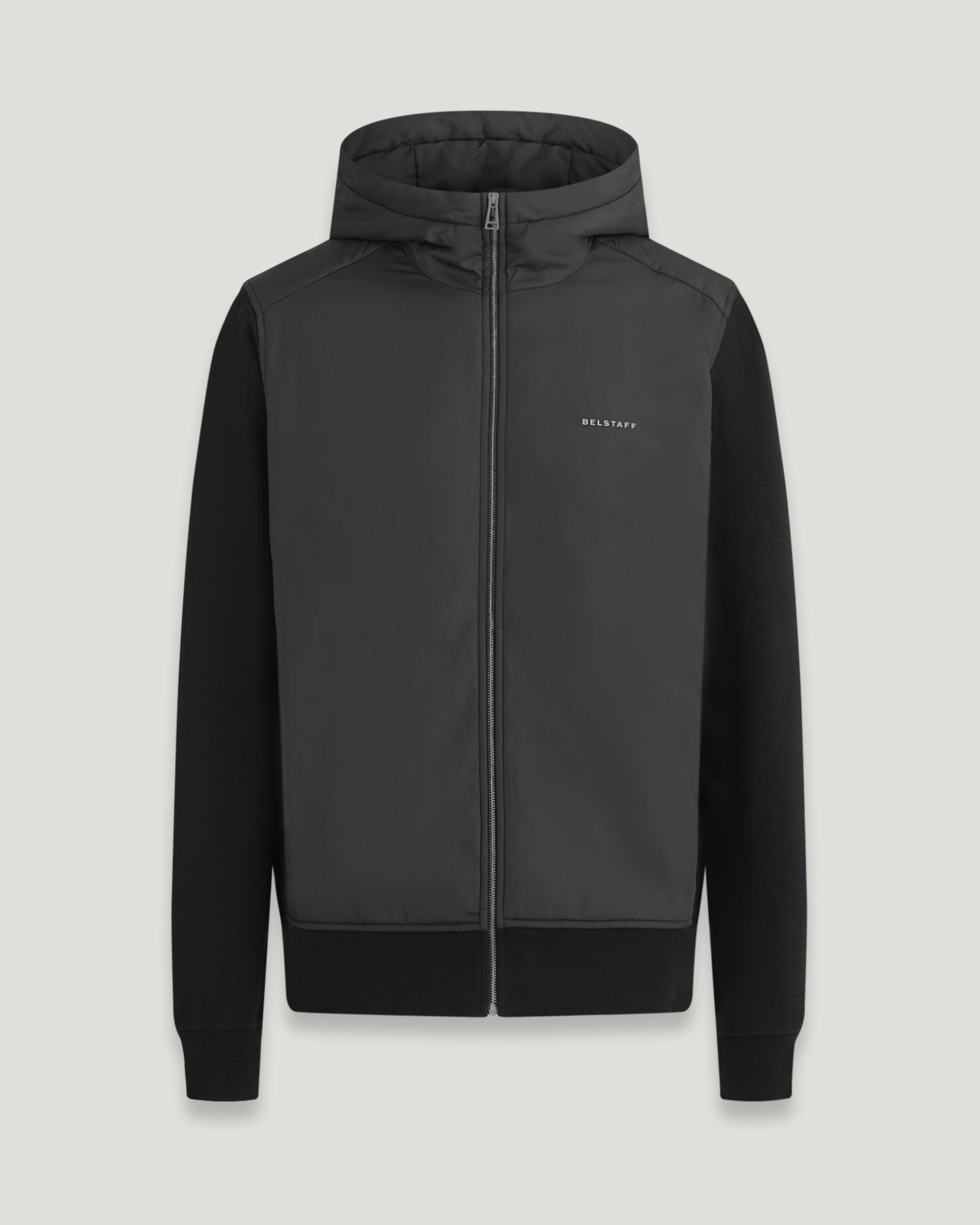 The Alloy zip through hoodie in Black is expertly crafted from compact, double-faced sweatshirt fabric with nylon panelling. It is accompanied by high thread count stretch cotton sleeves and trims and is finished with polished metal hardware. DETAILS - A compact double face knitted interlock sweatshirt fabric with technical shell nylon panelling - Lightweight insulation - Gunmetal hardware - Silicone Belstaff logo on left chest - Centre front full length zip - Waist pockets with press stud fastening - Recycled polyester - By choosing our cotton products, youare supporting Belstaff`s investment in Better Cottonas mission. This product is sourced via a system of mass balance and therefore may not contain Better Cotton. Learn more at bettercotton.org/learnmore - Body: 100% Cotton, Filling: 100% Polyester, Woven: 100% Polyester - Rib: 98% Cotton, 2% Elastane - Product ref: 105239BLACK SIZE AND FIT - Cut for a regular fit - Model wears a size L - Model measures: Height: 6'1", Chest: 39", Waist: 32a