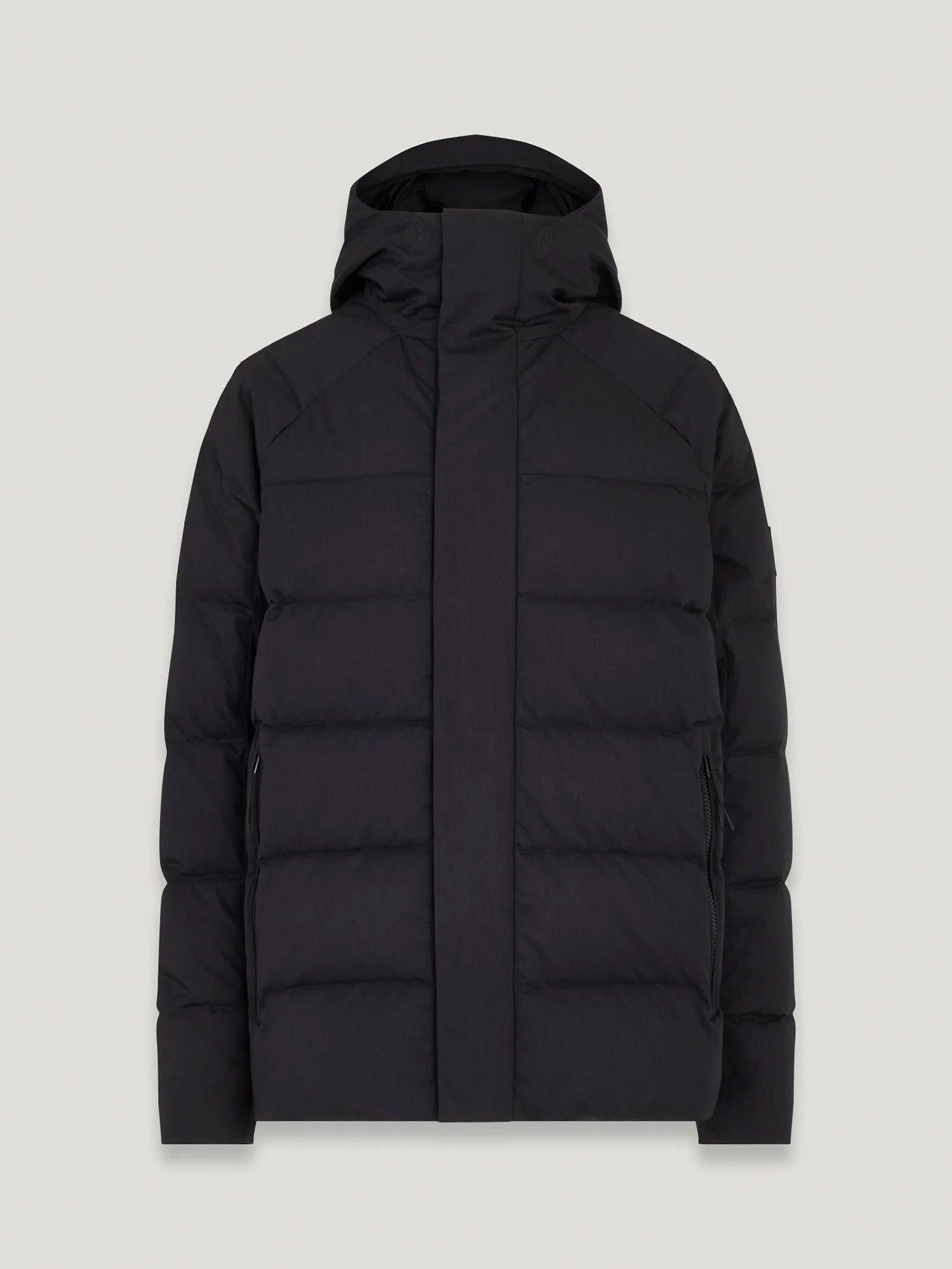 Our Apex jacket in black cotton nylon gabardine combines soft cotton yarn with strong nylon filaments to achieve a suede-like, snappy hand feel. It’s water resistant with a PFAS-free finish to keep you dry through autumn and winter. A classic piece you’ll have in your wardrobe for many years to come. DETAILS - Cotton nylon gabardine combines soft cotton yarn with strong nylon filaments to achieve both a sueded and snappy hand feel with a PFAS free water-repellent finish - Mid-weight versatile down jacket - Internal storm cuffs - Quick-adjust drawcord system for ease of use - Embroidered edge Belstaff phoenix patch on left sleeve - Centre front zip and press studs with covered placket - Hood drawcord with cohaesive adjustor - Hem drawcord - Hip pockets with zip fastening - Internal pocket with zip fastening - Water repellent - 750 fill power down - PFAS free water-repellent finish - By choosing our cotton products, youare supporting Belstaff`s investment in Better Cottonas mission. This product is sourced via a system of mass balance and therefore may not contain Better Cotton. Learn more at bettercotton.org/learnmore - Shell: 65% Cotton, 35% Polyamide - Filling: 90% Grey Duck Down, 10% Grey Duck Feather - Lining: 100% Polyamide - Product ref: 105278BLACK SIZE AND FIT - Cut for a regular fit