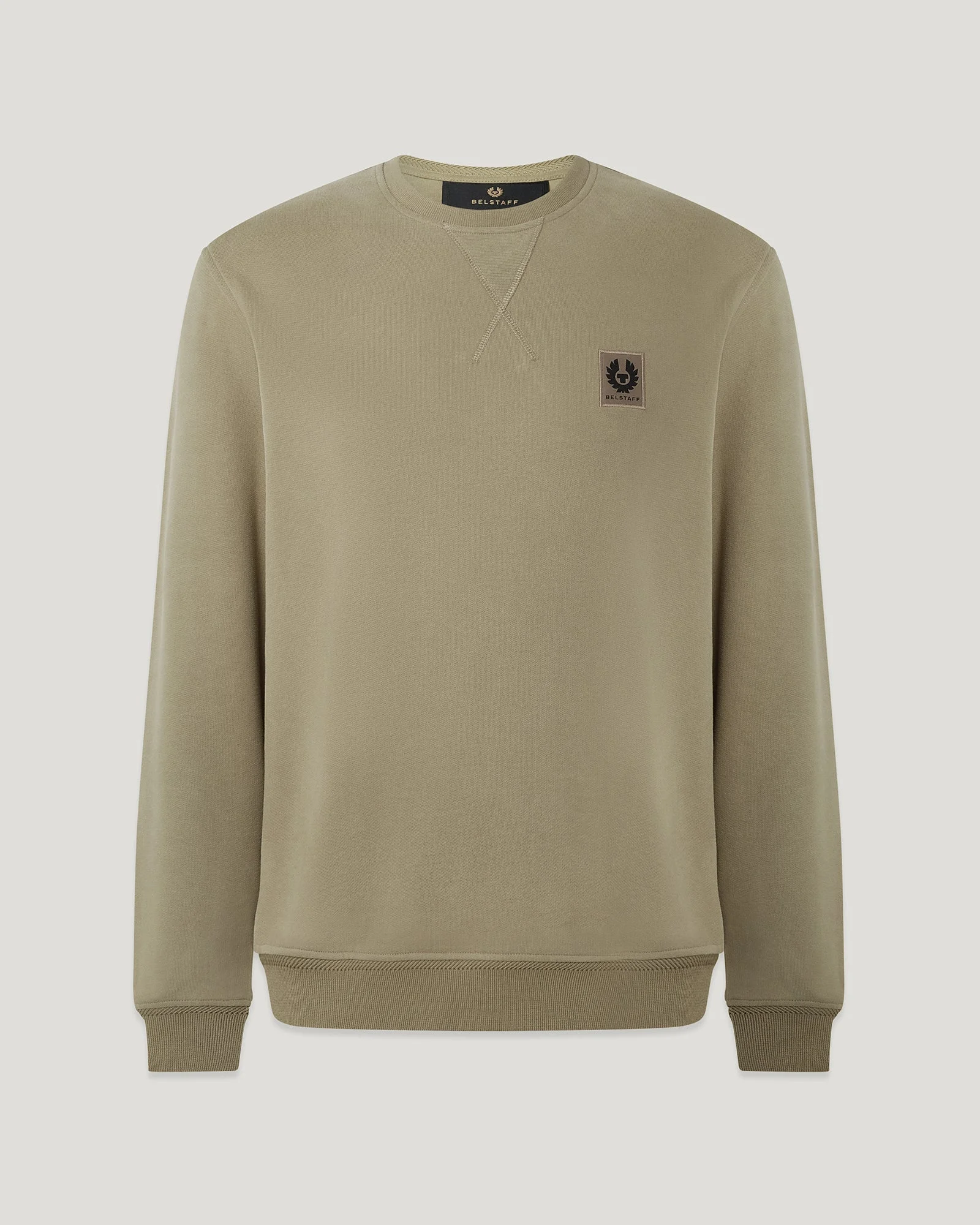 A failsafe sweatshirt cut with precision, this cotton fleece pullover in Fatigue Green is a year-round essential. The fabric is soft and breathable in natural fibres, providing lightweight comfort and durability wash after wash. DETAILS - Cotton fleece - Long sleeve sweatshirt with crew neck - Ribbed collar, cuffs and hem - Belstaff Phoenix patch on chest - Organically grown cotton - Body: 100% Cotton - Rib: 98% Cotton, 2% Elastane - Made in Turkey - Dyed in Turkey - Product ref: 100049FTGGN SIZE AND FIT - Cut for a regular fit - Model wears a size L - Model measures : Height: 6'1", Chest: 40", Waist: 31"