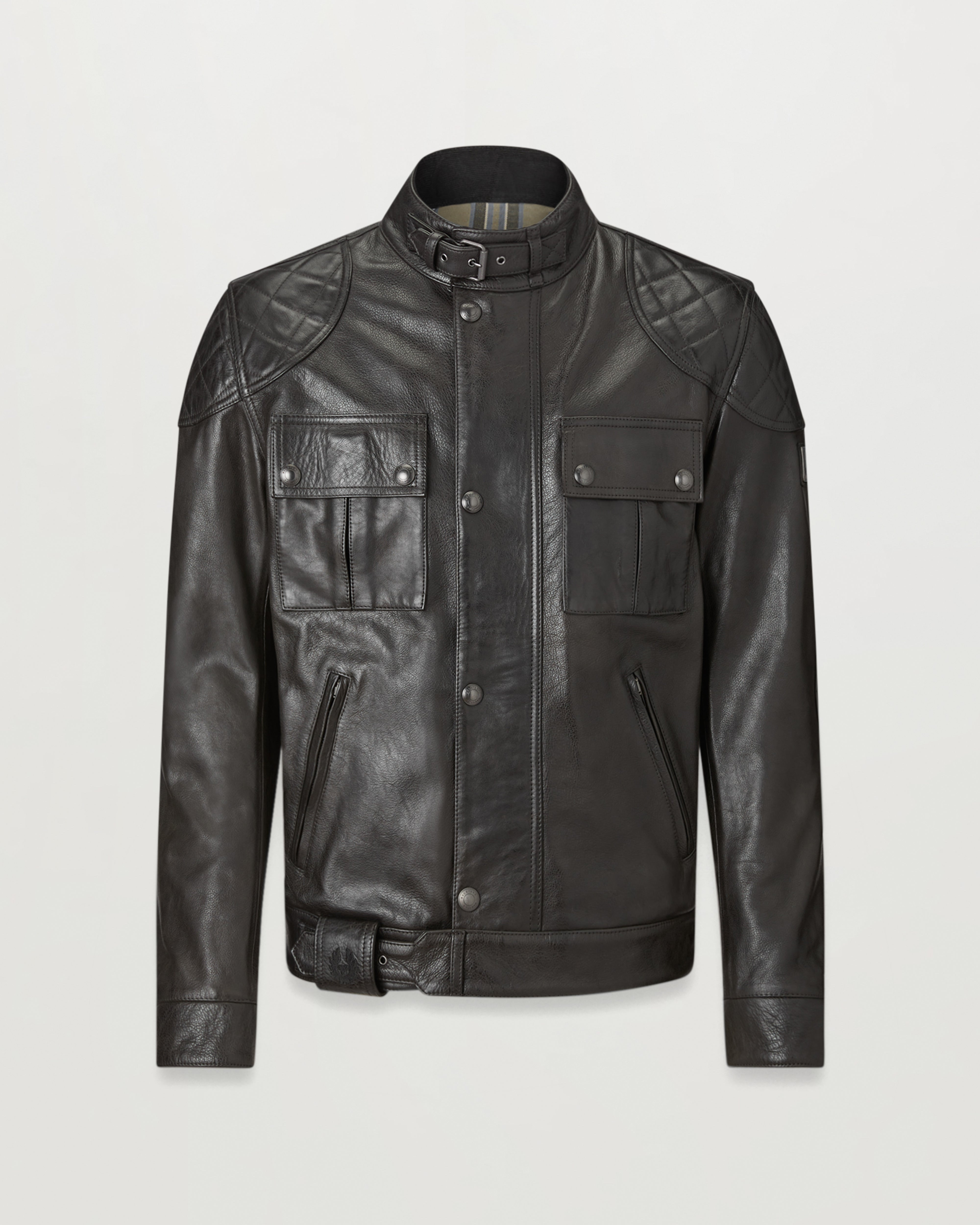 Requiring an 18-hour hand-waxing process to provide the colour and a patina unique to each jacket, the Brooklands in Antique Black is crafted from 100 per cent cow leather. Reinforcement beneath quilted shoulder and elbow patches and D3O shoulder and elbow armour combine for durability, comfort and protection. Oil resistant corduroy neck and cuff facings plus zipped side and inner pockets keep your valuables safe with the look completed by a metal patch logo and Belstaff checked woven cotton lining. DETAILS - Hand-waxed leather - Develops a unique patina over time - Protective reinforcement beneath elbow and shoulder patch - Signature check lining - Oil-resistant corduroy neck and cuffs - Zipped side and inner pockets - Adjustable, knurled throat latch fastening - Zipped back protection pocket - Quilted shoulder and elbow patches - Metal logo patch on left arm - Engraved stud fastenings - Buckle cover with embroidered logo - High stand collar - 100% cow leather - Certification: A - Protection: D3O Tri-ventilation level 1 (Elbow/Shoulder) - Product ref: 105376ATBLK SIZE AND FIT - Cut for a regular fit - Model wears a size L - Model measures Height: 6'1"- Chest: 40"- Waist: 31"