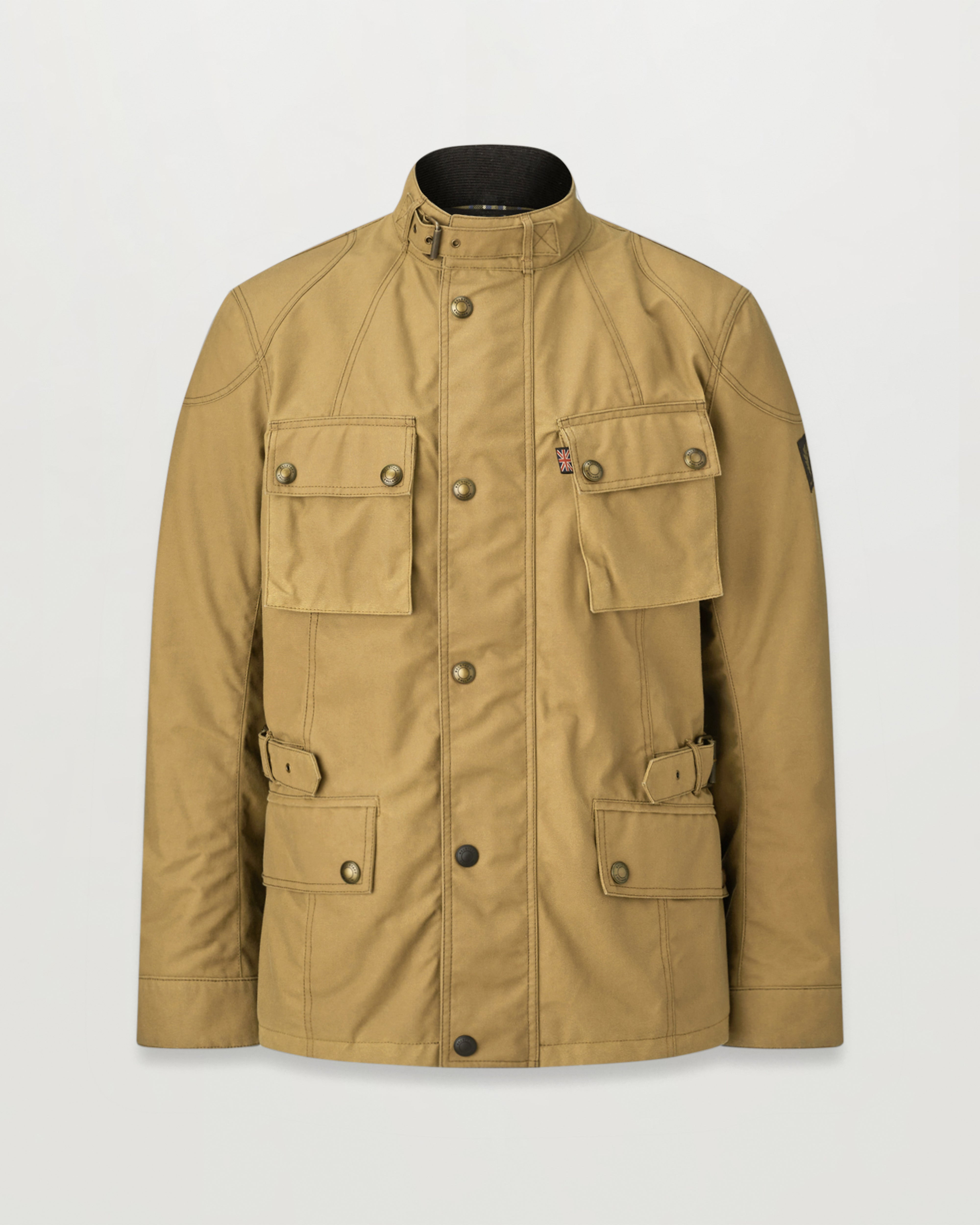 Hip-length with shaped panel seaming, the Crosby in Sand is light but tough thanks to British Millerain 8oz, technical waxed cotton that keeps the elements at bay. Comfort’s assured thanks to waist adjustment buckles and an interlayered breathable, waterproof membrane, and safety features include D3O shoulder and elbow armour. Twin needle stitching and oil resistant corduroy neck and cuff facings make it hard-wearing, and the archival check lining and engraved antique brass fastenings add to the classic styling. DETAILS - 8oz. British Millerain technical waxed cotton - Compatible with snap-in climate vest - Breathable, waterproof membrane - Shaped panel seaming for a slim fit - Hip length - Protective reinforcement beneath elbow and shoulder patches - Oil-resistant corduroy collar and cuffs - Zipped internal pocket - Knurled buckle and strap fastening throat latch - Zipped back protection pocket - Twin needle topstitching for strength - Adjustable buckled waist - Engraved antique brass fastenings - Adjustable cuffs with gusset - Belstaff logo patch on left arm - 65% polyester, 35% cotton - Certification: AA - Protection: D3O Tri-ventilation level 1 (Elbow/Shoulder) - Product ref: 104968SAND SIZE AND FIT - Cut for a regular fit - Model wears a size M - Model measures: Height: 6'1", Chest: 40", Waist: 32â