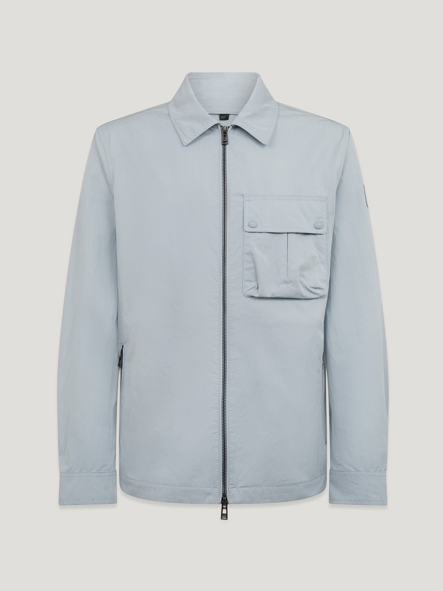 The Drome overshirt in Quarry Blue is a versatile piece with pleated Belstaff utility pockets. It's made from cotton nylon gabardine – combining cotton yarn with strong nylon filaments to achieve softness and smartness. The water-repellent finish is perfect for inclement weather. DETAILS - Woven tonal sleeve patch - Centre front zip opening - Adjustable press stud cuff fastening - One bellowed, pleated chest pocket - Two zip entry hip pockets - Water repellent - 65% Cotton, 35% Polyamide (Recycled) - Product ref: 105450QRYBL SIZE AND FIT - Cut for a regular fit