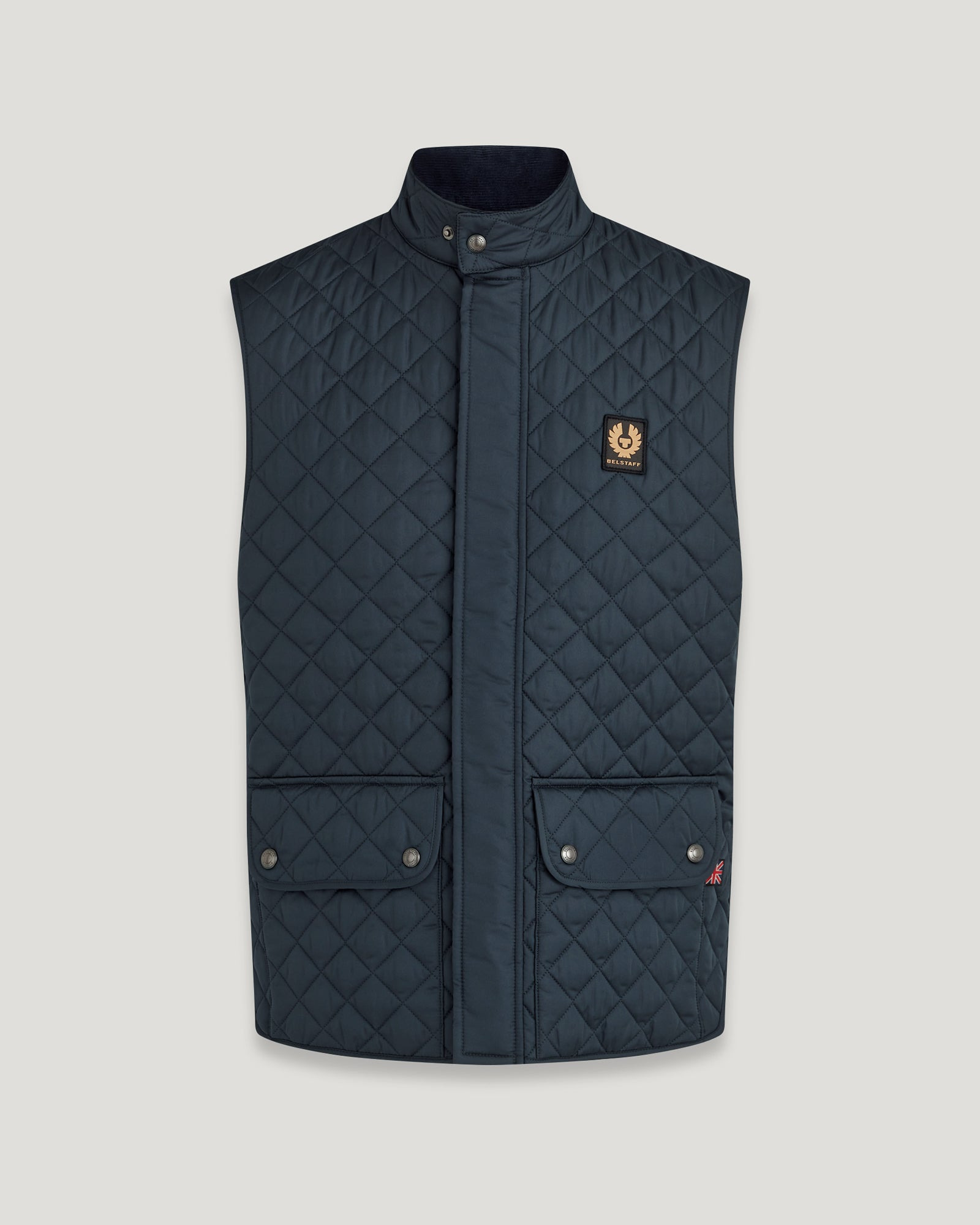 Meet the Icon Gilet in Dark Ink. This diamond-quilted padded vest can be snapped into the Trialmaster and Fieldmaster jackets to add a warming mid-layer, or worn solo when it's warmer. DETAILS - Quilted recycled nylon - Snaps into the Trialmaster, Trialmaster Panther Jacket and Fieldmaster Jacket - Soft corduroy collar - Belstaff phoenix patch - Snap-fastening centre front and collar fastening, snaps used to fasten into Icon styles - Snap-fastening waist adjustors - Two large lower press-stud pockets, internal zipped pocket - Water repellent - Recycled polyester - Shell: 100% Polyester Filling: 100% Polyester Lining: 100% Polyester - Product ref: 105295DKINK SIZE AND FIT - Cut for a regular fit