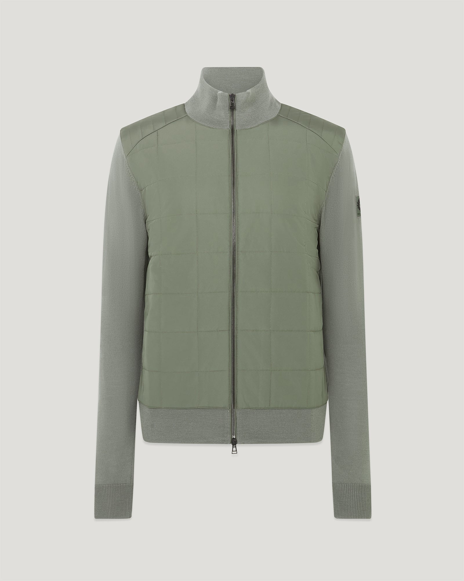 Meet the Kelbrook zip cardigan in Sage Green. Inspired by military uniforms and made for updating your daily wardrobe, this boxy zip-through knit combines structured panelling with soft merino wool for an elevated finish. DETAILS - Extra fine merino - Channel quilted shoulder reinforcement detailing - Ribbed cuffs and hem - Quilted mixed media body - Belstaff phoenix patch on left sleeve - Centre front zip fastening - Non-mulesed wool - Front: 100% Recycled polyester, Woven: 100% Extrafine merino wool, Filling: 100% Recycled polyester - Product ref: 105303SAGGR SIZE AND FIT - Cut for a slim fit