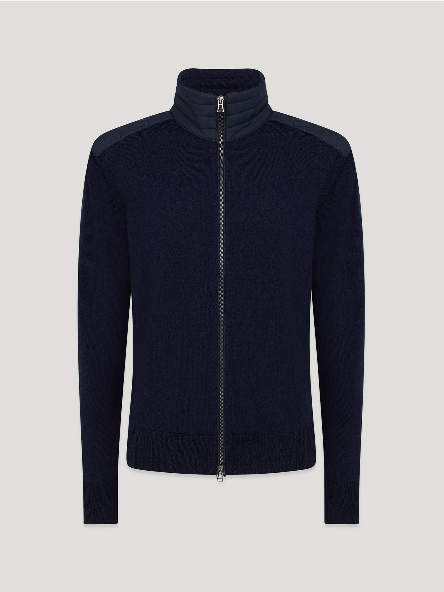 The Kelby zip cardigan in Dark Ink offers a versatile layer, crafted from virgin merino wool. Wear it open as a light outer layer or zip it up to enjoy the warmth of its channel-quilted stand collar. DETAILS - Virgin merino wool with polyester detailing - Channel quilted shoulder reinforcement detailing - Ribbed cuffs and hem - Belstaff phoenix patch on left sleeve - Centre front zip fastening - Non-mulesed wool, recycled polyester contrast - Body: 100% Extra-fine merino wool Woven: 100% Recycled polyester Filling: 100% Recycled polyester - Product ref: 105598DKINK SIZE AND FIT - Cut for a slim fit - Model wears a size L - Model measures: Height: 6'3", Chest: 38", Waist: 32"