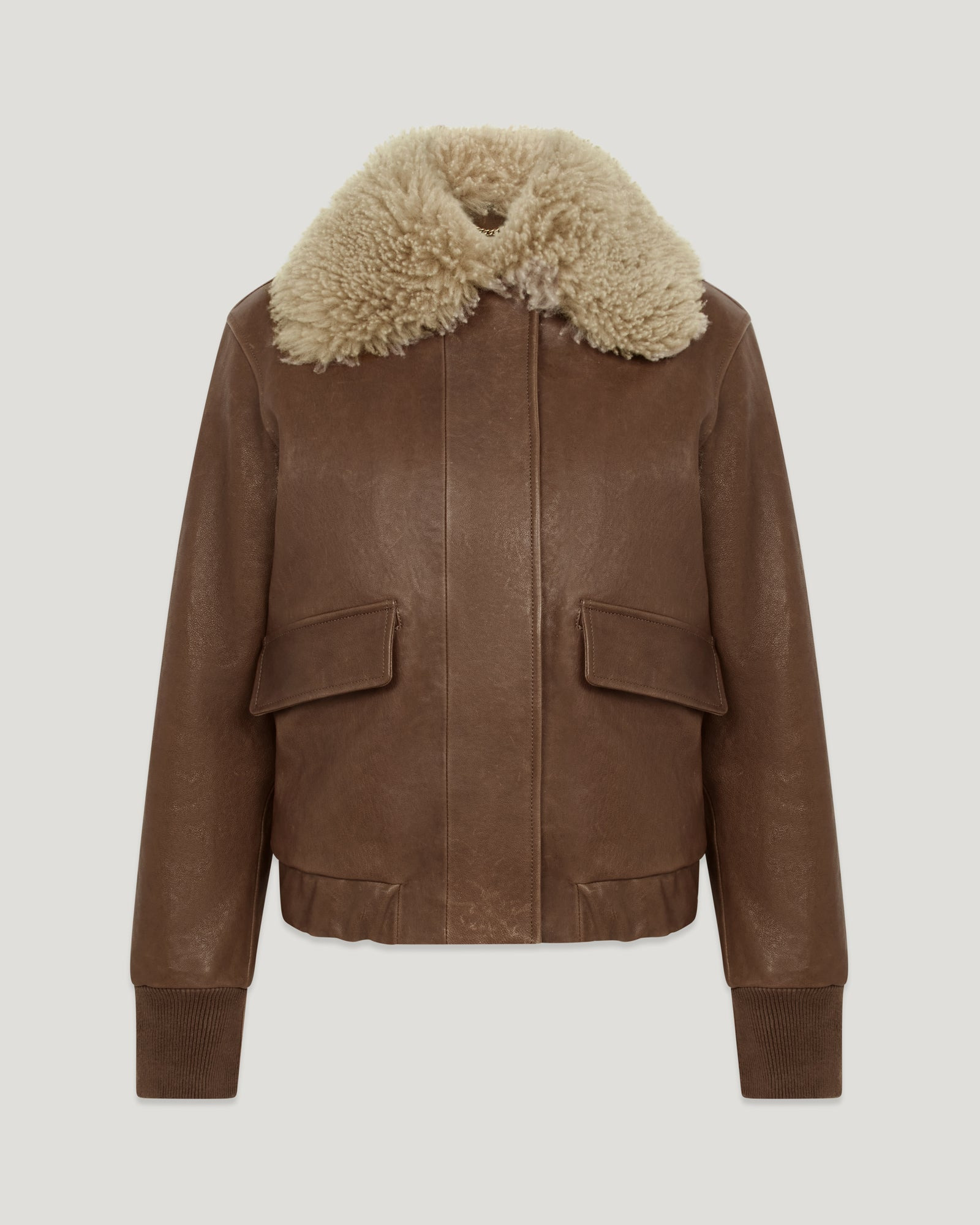 The Knox jacket in Dark Earth is a modern, functional bomber style. It’s made from premium soft lamb skin leather for exceptional softness and features a removable shearling collar for an adaptable look. This women’s jacket features an authentic flight jacket silhouette with an internal elasticated hem to cinch and sit close to the body. Layer it over a T-shirt or a lightweight knit for a classic, stylish look this season. DETAILS - Blouson silhouette with internal elasticated hem to cinch and sit close to the body - Detachable shearling collar detail - Centre front zip closure and placket with concealed snaps - Top entry hip pockets with a flap - Belstaff's leather products support responsible manufacturing via the Leather Working Group - Shell: Sheep leather, Collar: 100% Dyed lambskin, Body and sleeve lining: 100% Viscose, Filling: 100% Polyester - Product ref: EARTH-106002DKERT SIZE AND FIT - Cut for a relaxed fit - Model wears a size S - Model Measures: Height: 5'7", Hip: 36", Waist: 24.5"