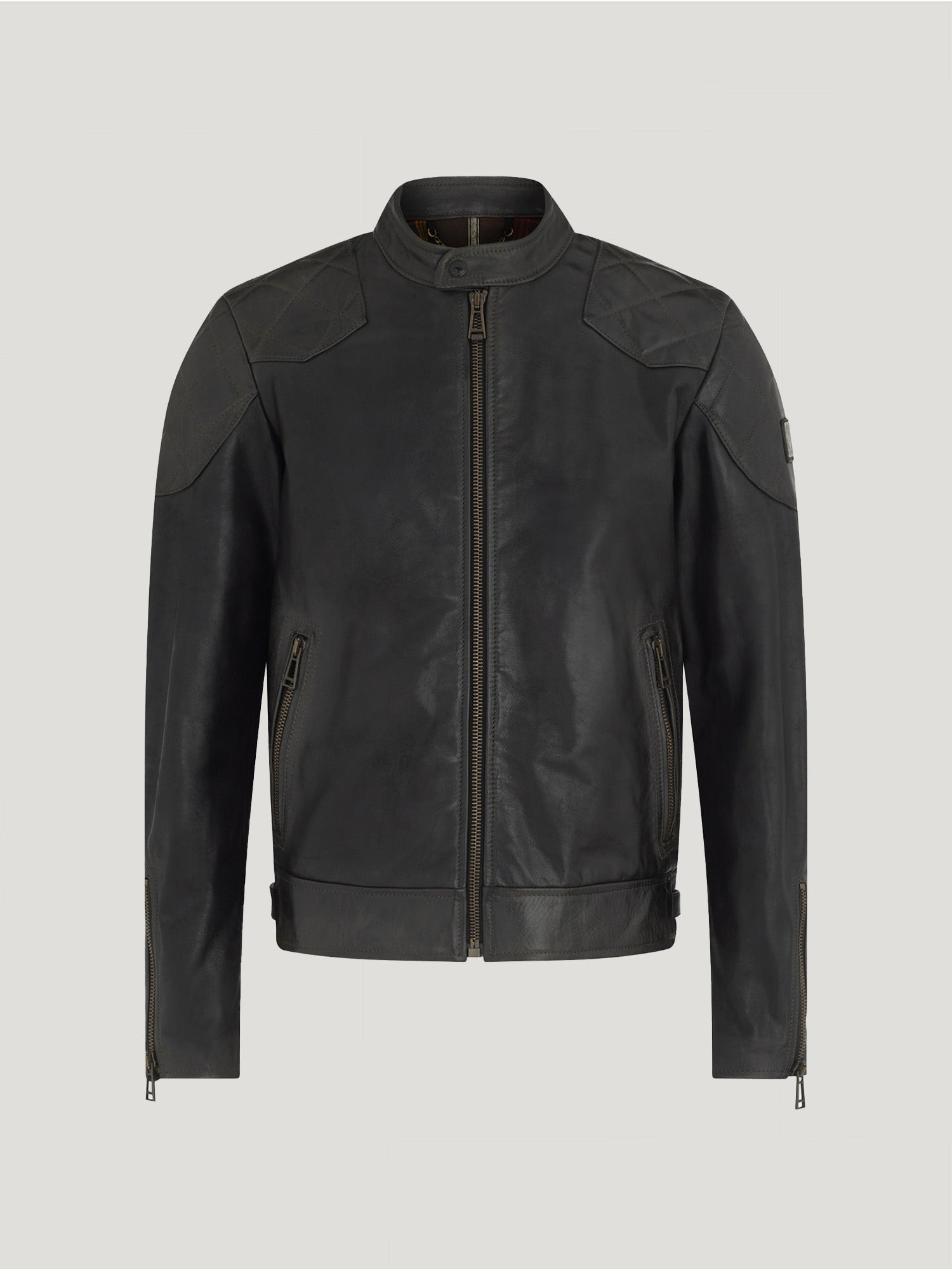 The Legacy Outlaw Jacket. A hand-waxed leather, washed and treated for a worn effect give this piece an assertive edge. A classic biker style that will age beautifully. Belstaff`s leather products support responsible manufacturing via the Leather Working Group. DETAILS - Hand-waxed leather, washed and treated for a worn effect - Patina will darken with age - Café-racer jacket - Archival check lining - Café racer-style collar with snap button fastening - Centre front zip fastening - Two side zip pockets - Metal plaque on sleeve - Shell: 100% Cow leather, Body lining: 100% Cotton, Sleeve lining: 100% Viscose/Rayon - Product ref: 104619ATBLK SIZE AND FIT - Cut for a slim fit - Model wears a size 48 - Model measures: Height: 6'3", Chest: 37", Waist: 32"