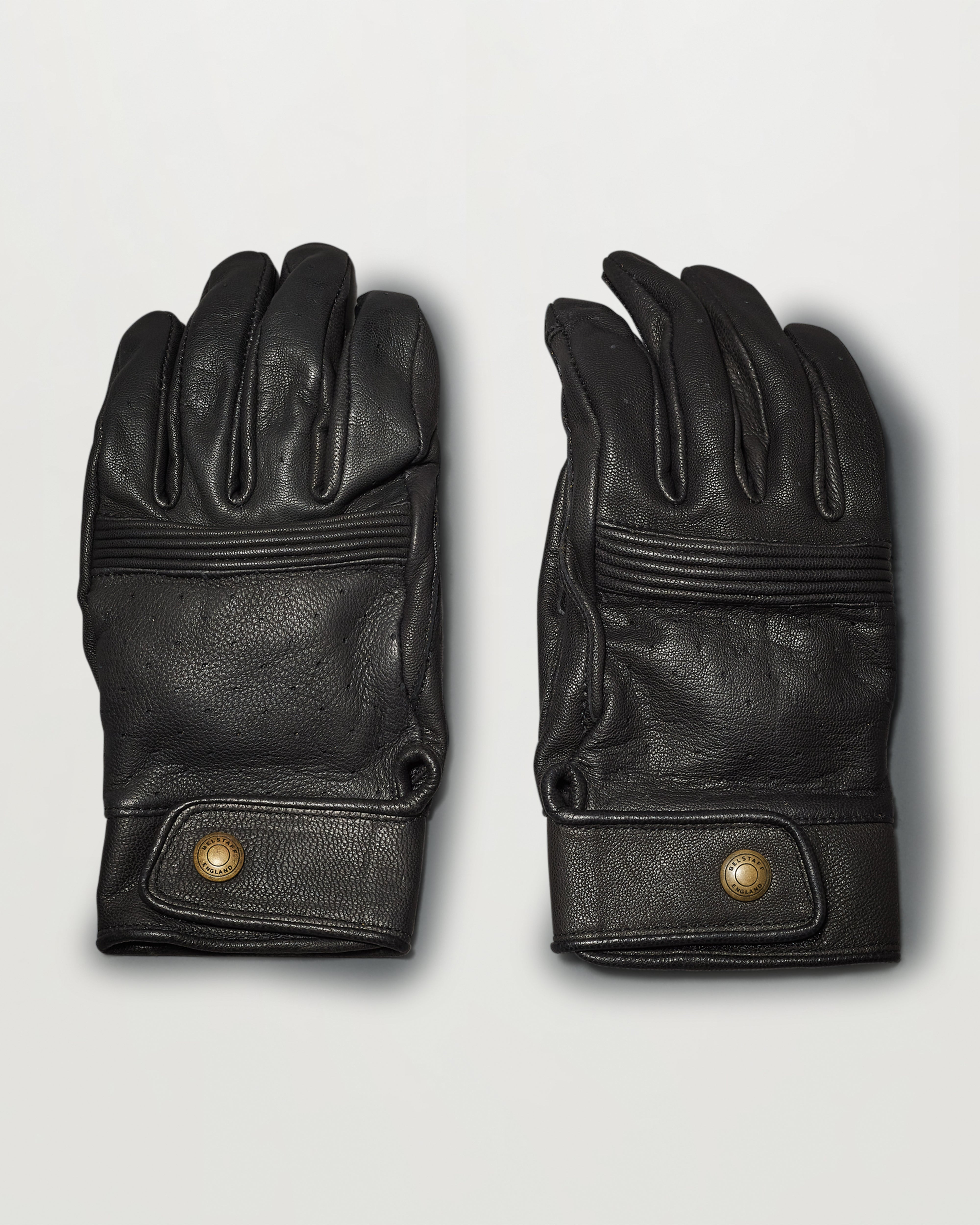 Perforated for breathability, the goatskin leather Montgomery glove is designed with summer rides in mind. Featuring a 100% polyester lining, the sensitive leather on the index fingers is smartphone-friendly while the elasticated knuckle section, adjustable cuff, 100% polyester padding and velcro fastening strap ensure a great fit. The look is completed with decorative snaps. DETAILS - Summer glove with perforation for breathability - Smartphone-friendly touch sensitive leather on the index fingers - Elasticated knuckle section - Velcro fastened strap - Decorative snaps - Adjustable cuff - Shell: 100% goat leather, Lining: 100% polyester - CE level 1 - Product ref: 105382BLACK SIZE AND FIT - Cut for a regular fit