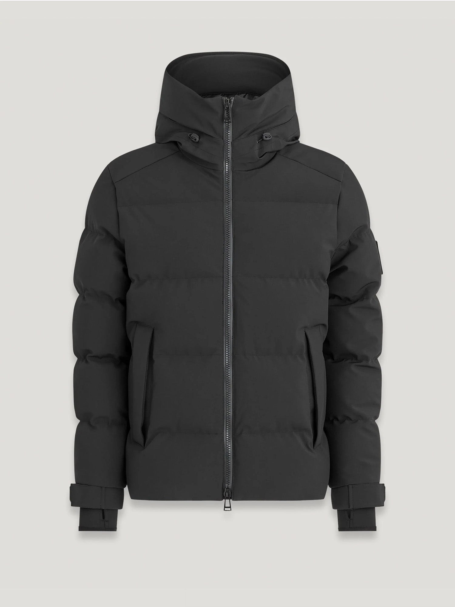 The Pulse jacket in black. A technical hooded down jacket with three-layer stretch and large quilt channels which is weather protective but not restrictive, super light and allows a full range of movement. This winter-ready piece features 800 fill power down – a premium down that is much warmer than the average without any additional weight. DETAILS - 3-layer stretch nylon shell with Durable Water Repellent finish - Technical hooded down jacket with large quilt channels - Fleece-lined chin guard - Storm cuff with thumbhole - Adjustable cuffs - Silicone Belstaff logo on placket and cuffs - Belstaff logo patch on left sleeve - Silicone branded Velcro - Two-way aquaguard zip - Silicone branded concealed storm placket - Drawcord adjustable hood and hem - Two side-entry fleece-lined hand warmer pockets - Elasticated pocket entry - Left internal pocket - Water repellent - 800 fill power down - 100% RDS certified down and feather (IDFL CERT TE-00103785) - Recycled polyamide lining - Shell face: 90% Polyester, 10% Elastane - Backing: 100% Polyester, Lining: 100% Polyamide, Filling: 90% White Duck Down, 10% White Duck Feather - Product ref: 105315BLACK SIZE AND FIT - Cut for a regular fit - Model wears a size US 38 - Model measures: Height: 6'2", Chest: 37", Waist: 29"