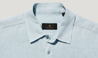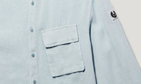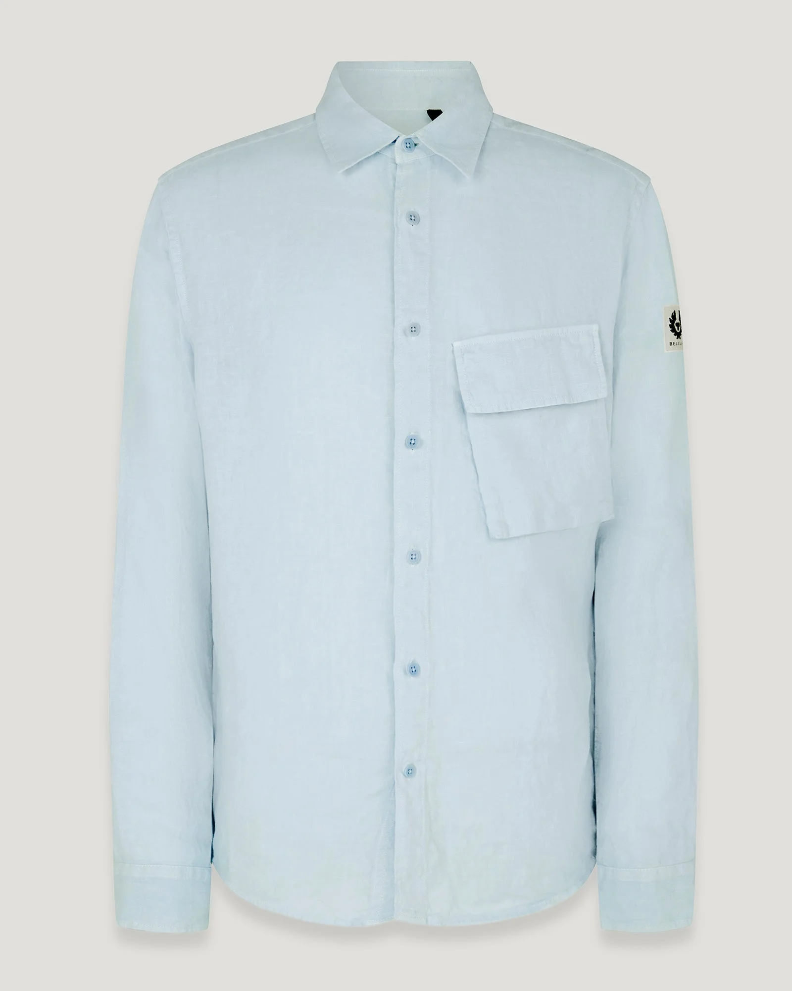 The Scale shirt in Sky Blue is crafted from structured linen with a garment-dyed finish. This effortless piece is ideal for spring-summer styling and casual layering. DETAILS - Garment-dyed linen - Signature tilted chest pocket with button flap - Point collar - Adjustable button cuff - Belstaff phoenix patch on left sleeve - Button front closure - Tilted, bellows pocket with concealed button flap - Product ref: 105651SKBLU SIZE AND FIT - Cut for a regular fit - Model Measures: Height: 6'0", Chest: 40", Waist: 31" - Model wears a size M