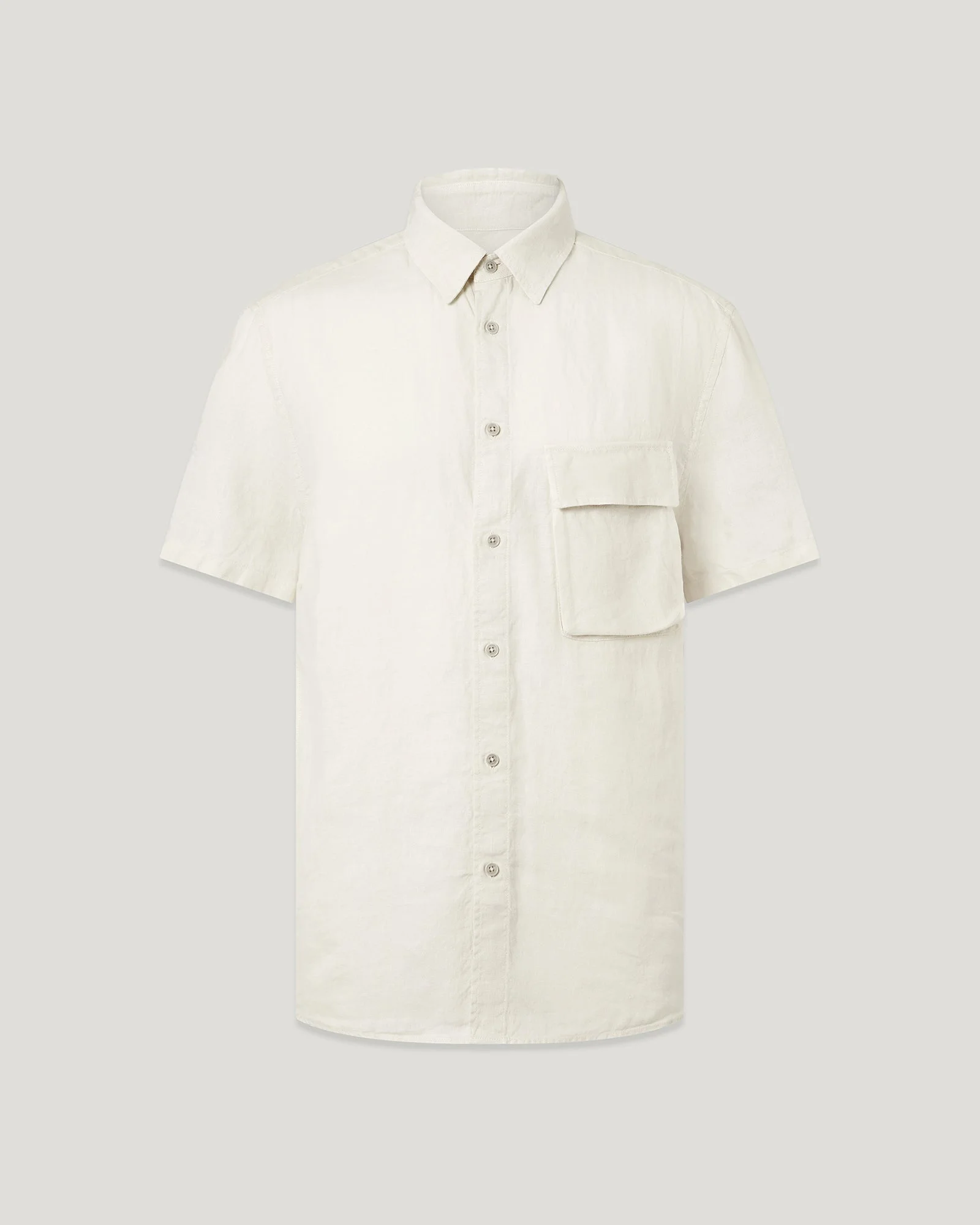 Meet the Scale short-sleeve shirt in Silver Birch. This classic, yet modern piece is crafted from garment-dyed linen for ultimate softness. Our clever dyeing process provides a deeper colour with natural variation and a lived-in feel, so the shirt feels like an old favourite from day one. DETAILS - Signature tilted chest pocket with button flap - Point collar - Adjustable button cuff - Belstaff phoenix patch on left sleeve - Tilted, bellows pocket with concealed button flap - Regular fit - 100% linen - Made in Portugal - Dyed and woven in Portugal - Product ref: 105644SVRBC SIZE AND FIT - Cut for a regular fit