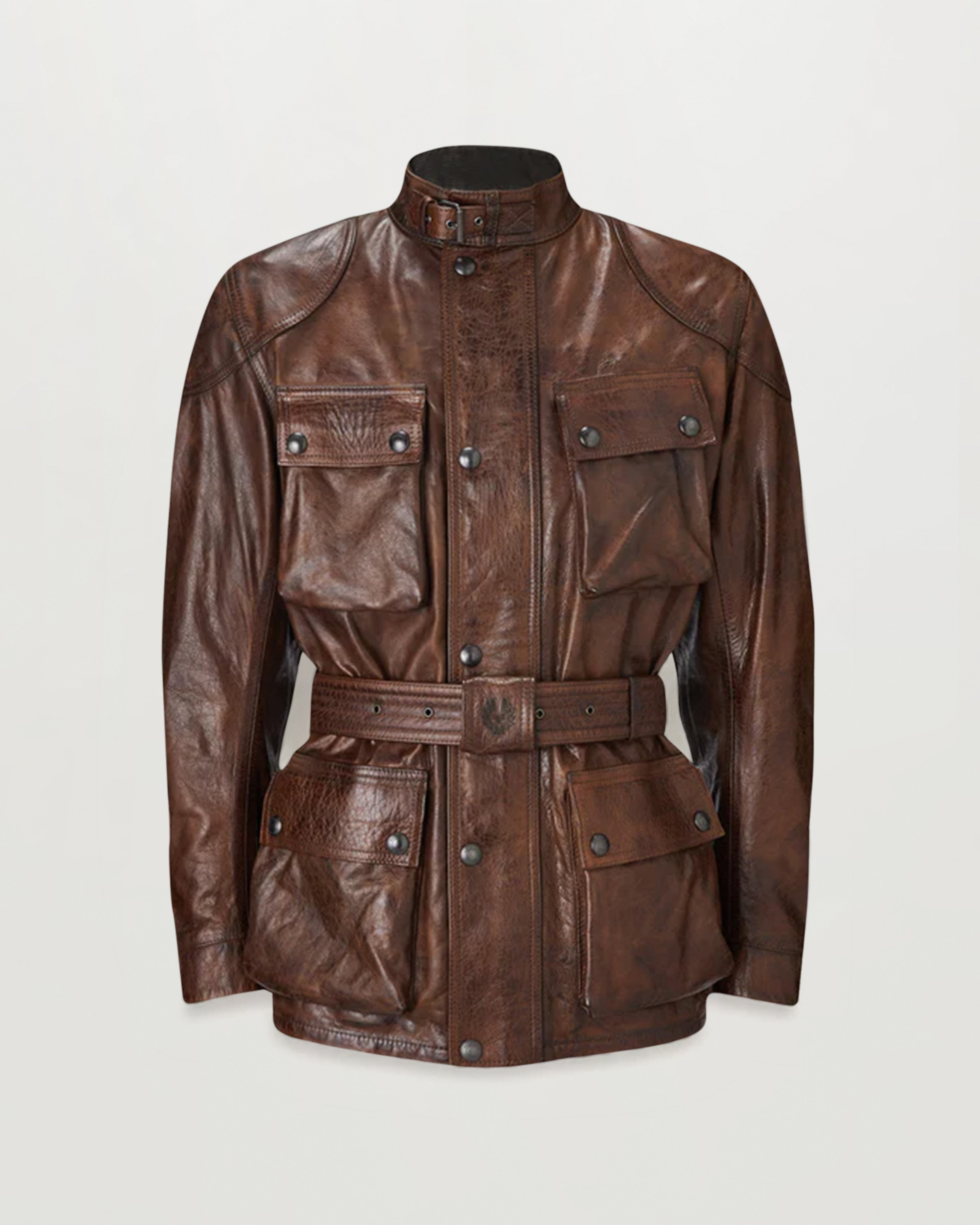 Crafted from 100 per cent cow leather, an 18-hour hand-waxing process provides the colour and ensures each jacket has a unique patina and add to the oil resistant corduroy neck and cuff facings plus protective reinforcement beneath elbow and shoulder patches. Twin needle stitching ensure durability, and D3O shoulder and elbow armour offer protection. With swivel sleeves and underarm air vents for unrivalled mobility and comfort, the timeless Trialmaster styling is completed in Burnt Cuero with Belstaff checked woven cotton lining. DETAILS - Hand-waxed leather - Four front pockets - Develops a unique patina over time - Protective reinforcement beneath elbow and shoulder patch - Signature check lining - Oil-resistant corduroy neck and cuffs - Adjustable, knurled throat latch fastening - Swivel sleeve for 360Ë motion and comfort - Underarm metal airvents - Twin needle topstitching for strength - Zipped internal pockets - Engraved stud and buckle fastenings - Buckle cover with embroidered logo - Back protection pocket - 100% cow leather - Certification: A - Protection: D3O Tri-ventilation level 1 (Elbow/Shoulder) - Product ref: 105377BNTCU SIZE AND FIT - Cut for a regular fit - Model wears a size M - Model measures: Height: 6'1", Chest: 40", Waist: 32â