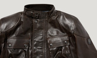 Crafted from 100 per cent cow leather, an 18-hour hand-waxing process provides the colour and ensures each jacket has a unique patina. Additional protection is provided by the oil resistant corduroy neck and cuff facings plus protective reinforcement beneath elbow and shoulder patches. Twin needle stitching ensures durability, and D3O shoulder and elbow armour offer protection. With swivel sleeves and underarm air vents for unrivalled mobility and comfort, the timeless Trialmaster styling is completed in Blackbrown with Belstaff checked woven cotton lining. DETAILS - Hand waxed leather (1-1.1mm thick) four pocket, longer, belted - Hand waxed to provide the colour - Unique patina to each jacket - Protective reinforcement beneath elbow and shoulder patches - Belstaff checked woven cotton liningA - Oil resistant corduroy neck and cuff facingsA - Knurled throat latch fastening buckle and strapA - Swivel sleeve for 360E motion and comfortA - Under-arm metal airventsA - Twin needle top stitching for strengthA - 15cm inside zip pocket for valuablesA - Engraved stud and buckle fastenings - Buckle cover with embroidered logoA - Back protection pocket - Metal patch logo on left arm - 100% Cow leather - Certification: A - Protection: D3O Tri-ventilation level 1 (Elbow/Shoulder) - Product ref: 105377BKBRN SIZE AND FIT - Cut for a regular fit - Model wears a size L - Model Measures: Height: 6'2", Chest: 39", Waist: 32"