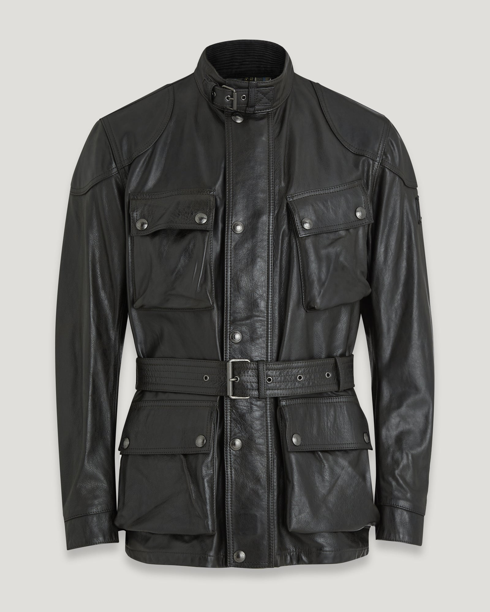 The premium leather counterpart to our iconic waxed cotton classic style, our Trialmaster Panther in black is a definitive Belstaff jacket. The distinctive details endure, from the slanted map pocket to the adjustable buckled collar and belt. Our artisanal hand finishing gives the leather a unique patina and adds a water-repellent property. The patina will darken and become richer with time and wear. DETAILS - Hand waxed leather with a patina that will darken with age - Classic Belstaff shape - Waist belt - Metal plaque on leather base on left sleeve - Centre front zip and snap placket - Buckle-adjusted collar - Four bellows pockets with dual press stud closure - Signature tilted left chest pocket - Belstaff`s leather products support responsible manufacturing via the Leather Working Group. - Shell: 100% Cow Leather, Body Lining: 100% Cotton, Sleeve Lining: 100% Viscose/Rayon - Product ref: 105312BLACK SIZE AND FIT - Cut for a regular fit - Model wears a size US 38 - Model measures: Height: 6'3", Chest: 37", Waist: 32"
