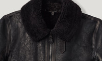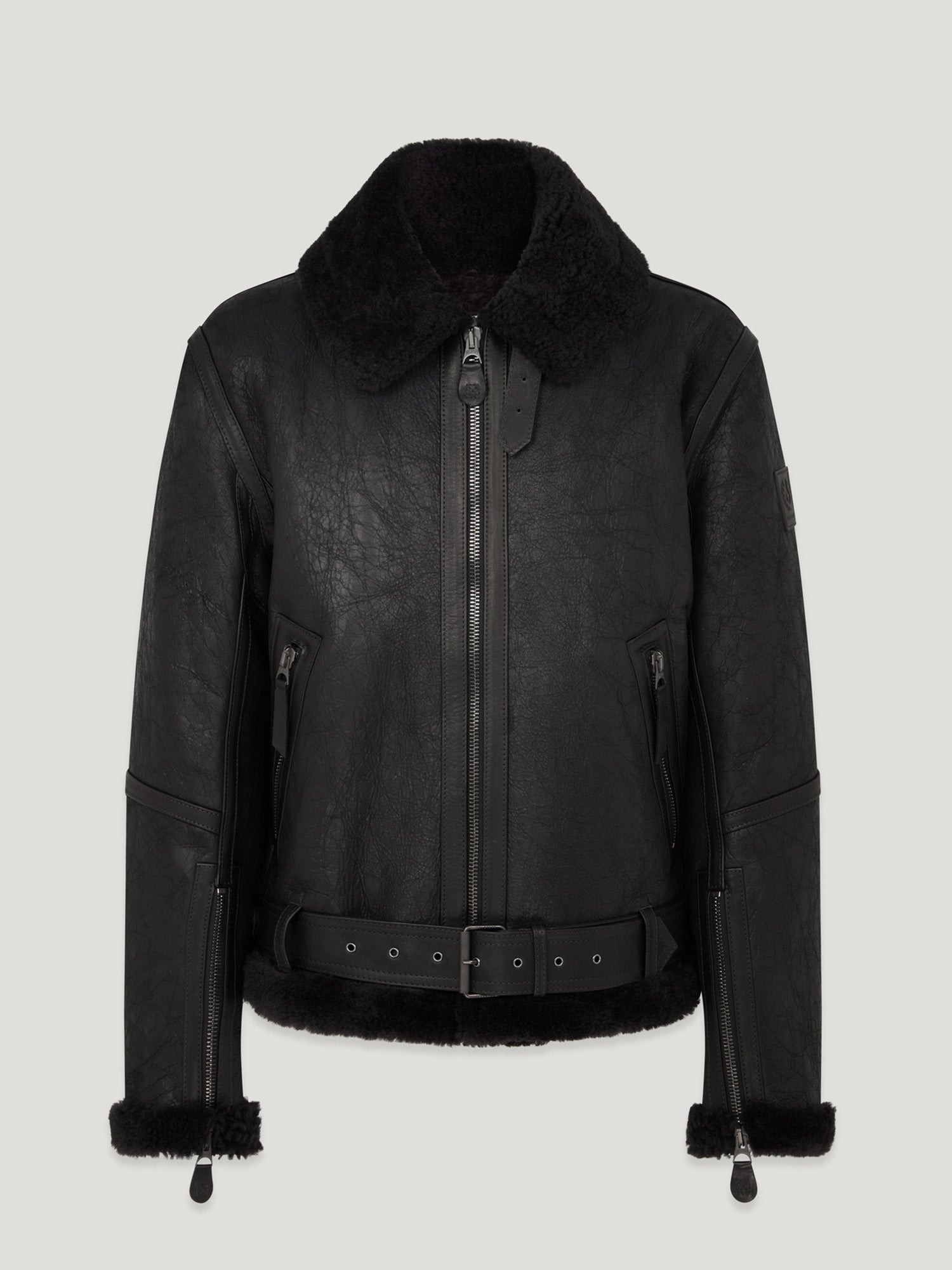 The Wilder Jacket takes its vintage looks from classic military styles. Ebony leather is complemented with hand-waxed aviator shearling in Washed Black / Black and brass-tone hardware. DETAILS - Hand waxed aviator shearling - Iconic shearling flight jacket style - Military inspired - Leather taping reinforcement on shoulders, sleeves and pockets - Leather phoenix patch on left sleeve - Centre front zip with buckle-adjusted collar and belt at hem - Two lower front zip pockets - Belstaff's leather products support responsible manufacturing via the Leather Working Group - Body: 100% Dyed lambskin, Trims: Cow leather - Product ref: 104544WBBLK SIZE AND FIT - Cut for a relaxed fit