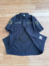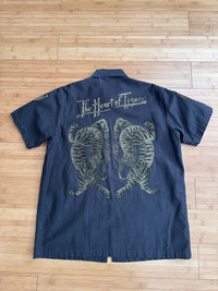 This button up is based on an US military Vietnam war BDU, kitted out with milspec buttons and patches. The back is an intricate embroidered twin tiger graphic. A beautiful piece.