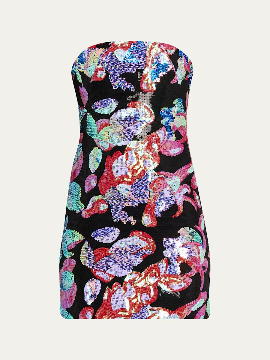 16ARLINGTON's "Stell" mini dress boasts an allover floral pattern entirely embellished with iridescent sequins Strapless neckline Sleeveless Hem falls above the knee Bodycon fit Center back zipper Polyester Made in United Kingdom