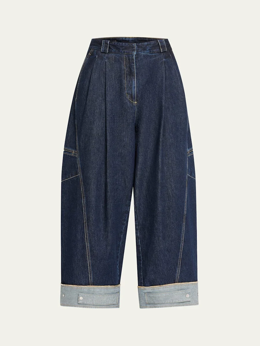 3.1 Phillip Lim curved wide-leg jeans featuring a contrast hem with adjustable button tabs High rise Pleated front Four-pocket style Loose fit Cropped length Snap/zip fly; belt loops Cotton Imported Online Inquiries: BGS21_T6RJX| Store Inquiries: #5026336