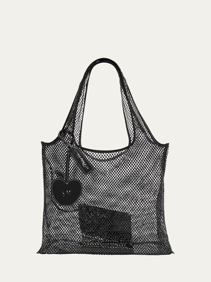 3.1 Phillip Lim market tote bag in mesh embellished polyurethane and polyester Shoulder straps with logo charm, 10.3" drop Open top Interior, leashed zip pouch bag Clear lining Approx. 13"H x 15"W x 8.3"D Wipe clean Imported
