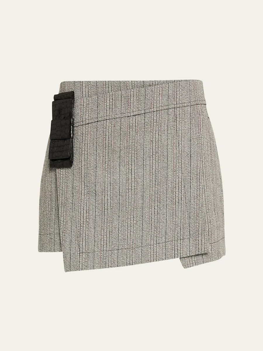 Tailored in Italian jaspe wool, this 3.1 Phillip Lim overlay mini skirt boasts a croc-ebossed vegan leather bow for an edgy finish with versatile styling. High rise Wrap silhouette Hem falls above the knee Center back zip Wool/cotton/polyester Lining: Cupro Dry clean Imported Online Inquiries: BGS21_T6Z1N| Store Inquiries: #5071346