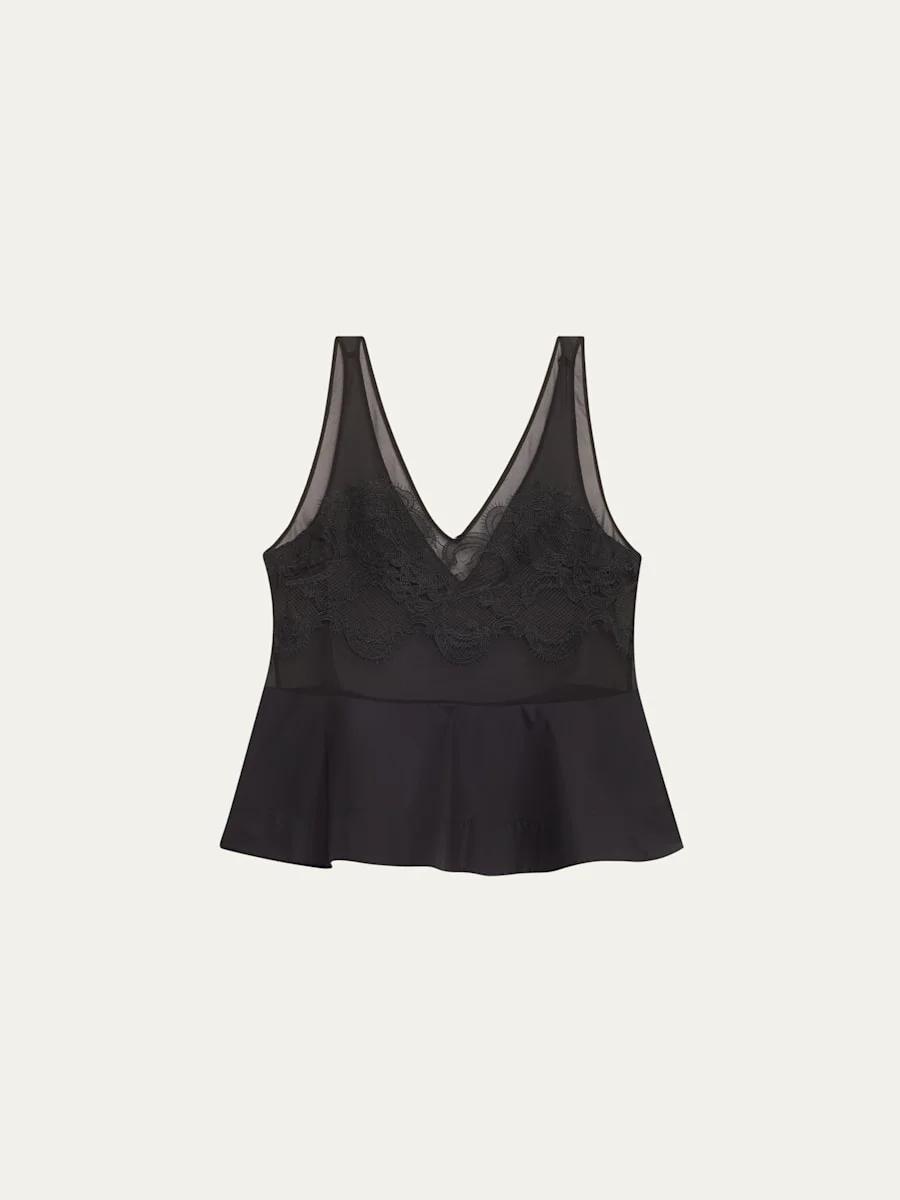 3.1 Phillip Lim peplum sheer tank top featuring lace trim and a solid flounce hem Plunging neckline Sleeveless Relaxed fit Pullover style Silk Dry clean Imported Online Inquiries: BGS21_T6DNM| Store Inquiries: #4964466
