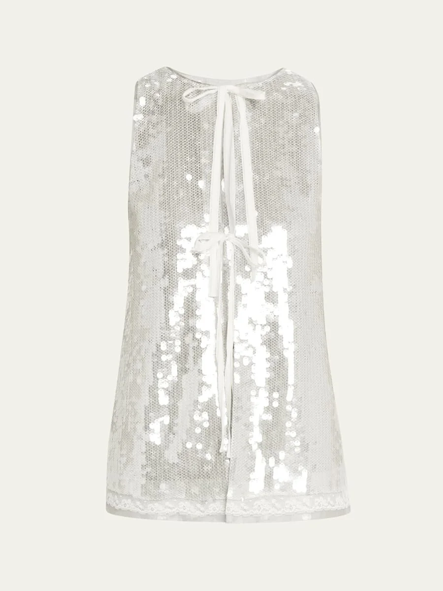 3.1 Phillip Lim sequinembellished blouse finished with a tie front and delicate lace trim Crew neckline Sleeveless Loose fit Hem falls to the hip Tiefront Polyester Dry clean only Imported
