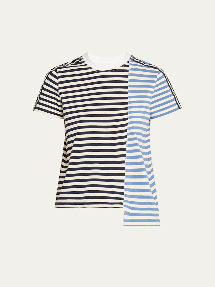 3.1 Phillip Lim T-shirt showcasing contrast horizontal stripes with an asymmetrical hem Approx. 23.5"L from shoulder to hem Accented by taping along the shoulders Crew neckline Short sleeves Pullover style Cotton Imported Online Inquiries: BGS21_T6RK7| Store Inquiries: #5026346