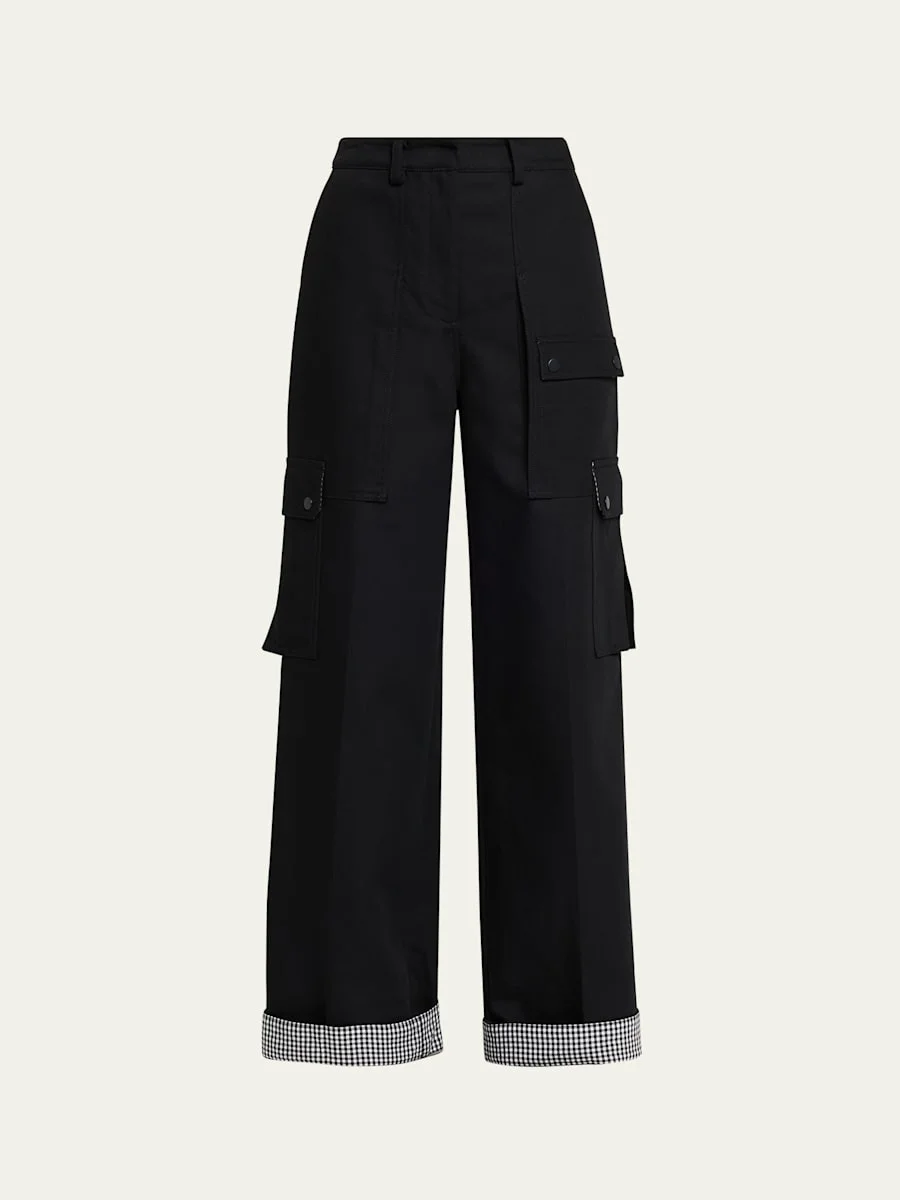 3.1 Phillip Lim utility-inspired cargo pants finished with contrasting cuffs Mid-rise; sits high on the hip Four-pocket style; flap pockets Wide legs Full length Snap/zip fly; belt loops Cotton Unlined Imported Online Inquiries: BGS21_T6Z1L| Store Inquiries: #5071344