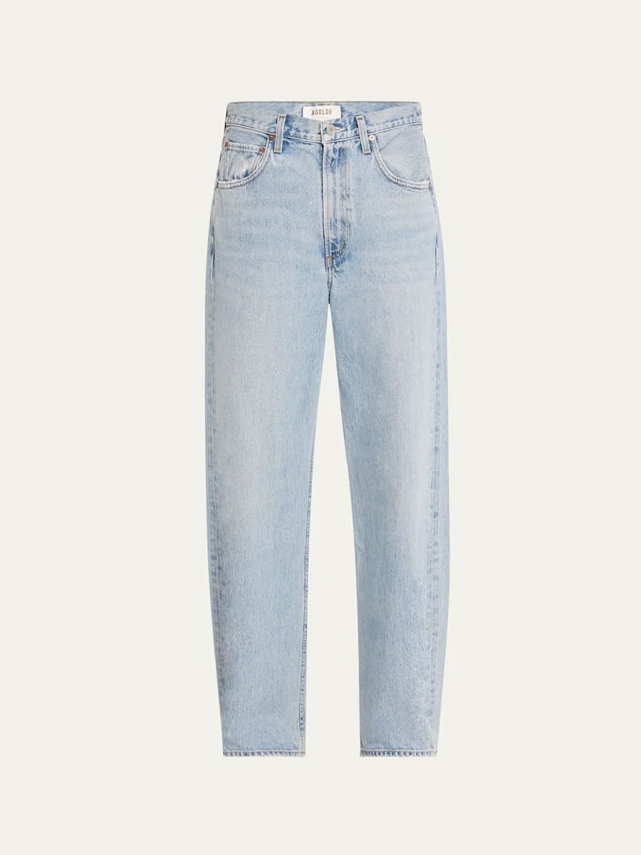AGOLDE wideleg jeans in lightwash denim Approx. measurements: 11.8" rise; 31" inseam Midrise; sits high on the hip Fivepocket style Subtle, tapered fit Full length Button/zip fly; belt loops Cotton Imported