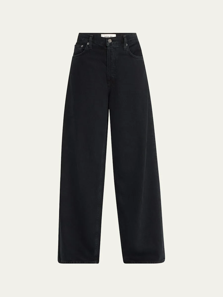 AGOLDE "Low Slung Baggy" jeans in black denim Lowrise; sits at the hip Fivepocket style Wide legs Full length Button/zip fly; belt loops Cotton Imported