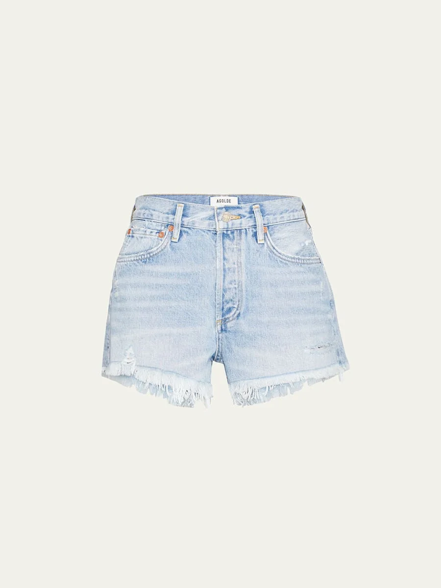 AGOLDE "Parker" distressed cut-off denim shorts. Approx. 11" rise; 2.5" inseam; 25" leg opening. Five pockets/button-zip fly. Belt loops. Cotton. Imported. Online Inquiries: BGS21_TY0JT| Store Inquiries: #2883648