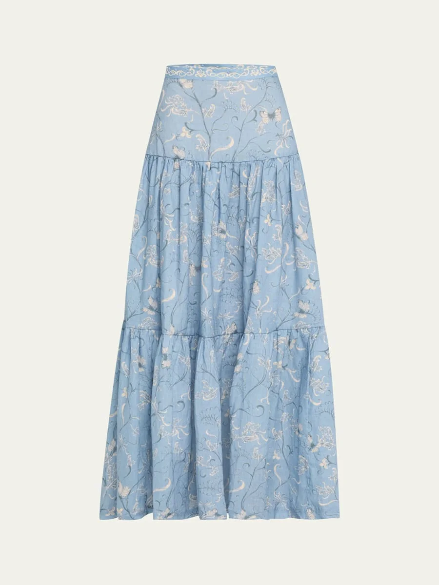Agua by Agua Bendita "Anis" tiered maxi skirt in allover Lymanopoda print High rise Full length A-line silhouette Back zip closure Linen Dry clean Made in Colombia Online Inquiries: BGS21_T69AP| Store Inquiries: #4935458