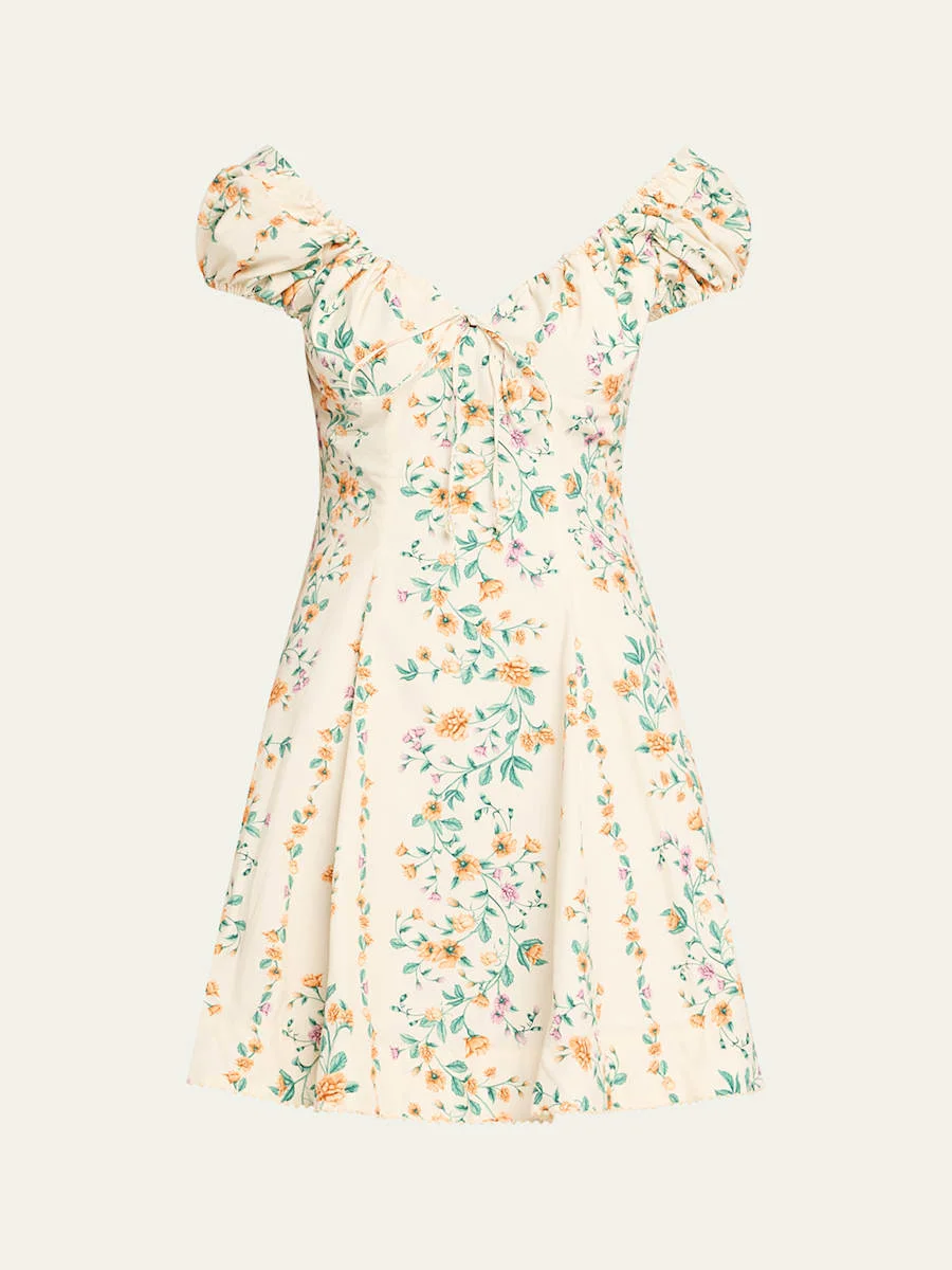 Agua by Agua Bendita "Mati" floral-printed dress crafted from pure cotton poplin with delicate central self-ties Sweetheart neckline Short sleeves Hem falls above the knee A-line silhouette Concealed back zipper Cotton Dry clean Made in Colombia Online Inquiries: BGS21_T6E4F| Store Inquiries: #4968102