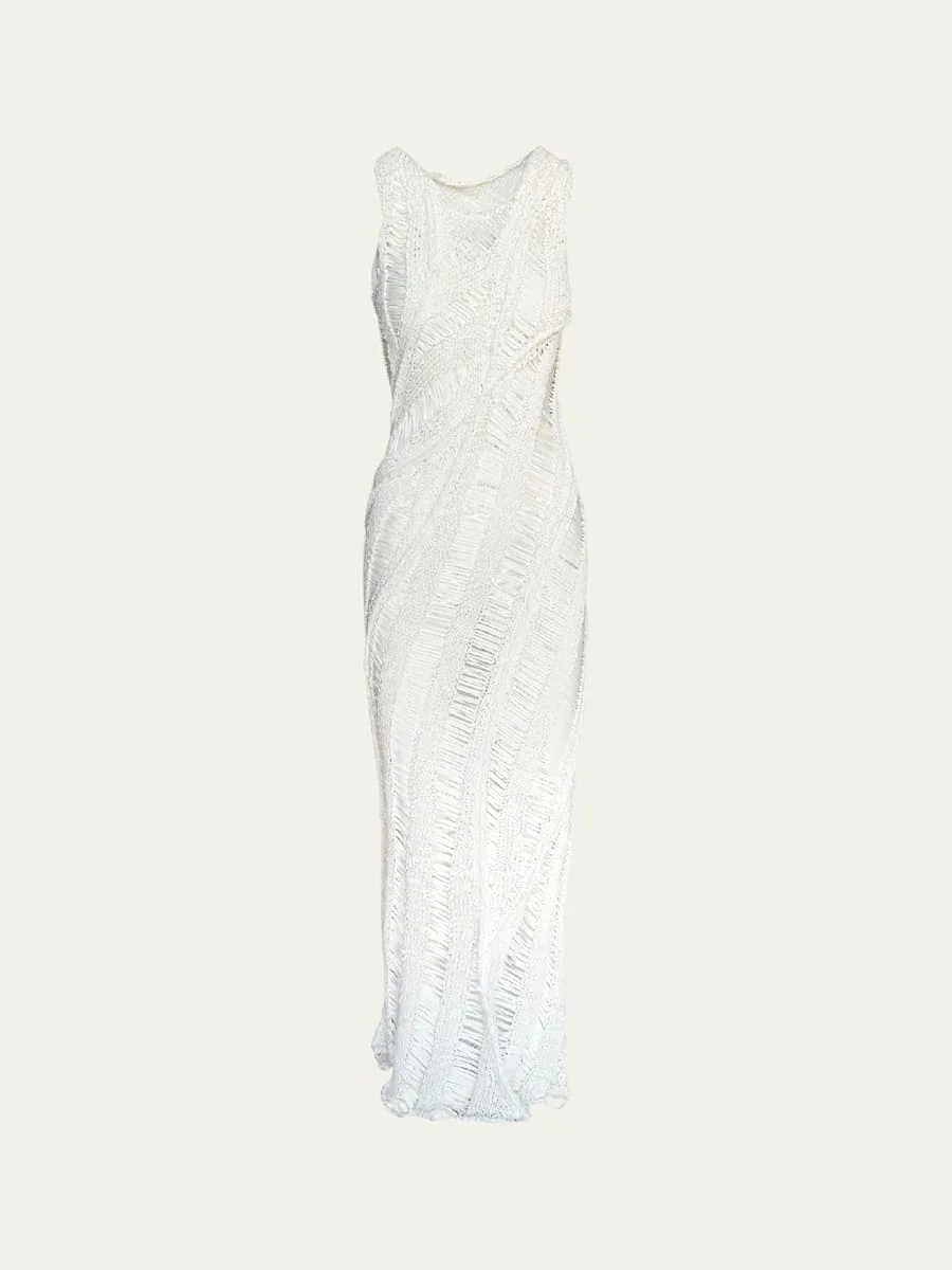 Aisling Camps "Kapok" drop-stitch dress inspired by the roots of a Kapok tree Approx. 60"L from shoulder to hem Asymmetric neckline Sleeveless Body-conscious silhouette Full length Slip-on closure Slit Length (inches): 19 Polyester/nylon/polyamide Unlined Made in USA from imported materials Model is 5'10"/177cm. Online Inquiries: BGS21_B9F2V| Store Inquiries: #4858733