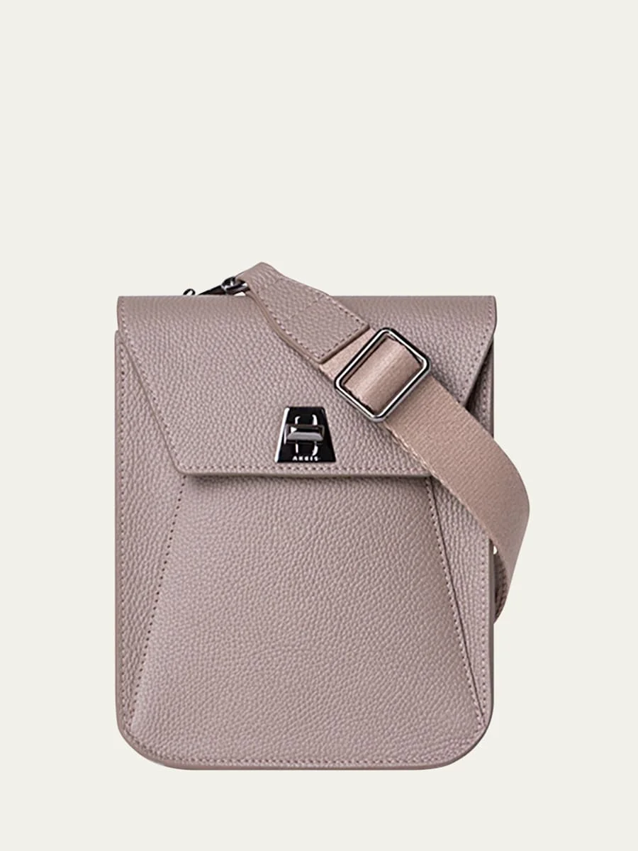 Akris "Anouk" messenger bag in leather Detachable, adjustable shoulder strap Flap top with turn-lock closure Exterior, one back slip pocket Approx. 5.7"H x 7.4"W x 1.7"D Made in Romania Online Inquiries: BGS21_V6N2H| Store Inquiries: #4648282