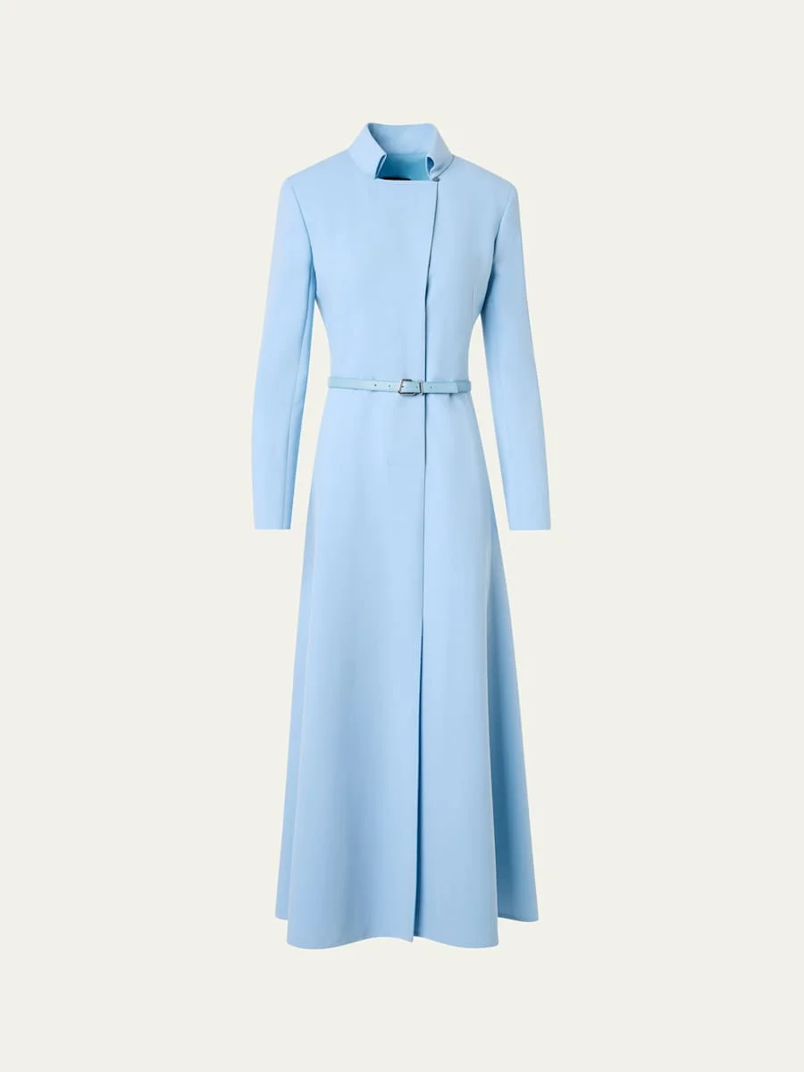 Akris shirtdress in signature doublefaced wool cut for a fluid drape Notched, refined collar; placket front Long sleeve; vented cuffs Skinny belt cinches waist Hem falls below the knee Aline silhouette Wool/nylon/polyamide Made in Switzerland