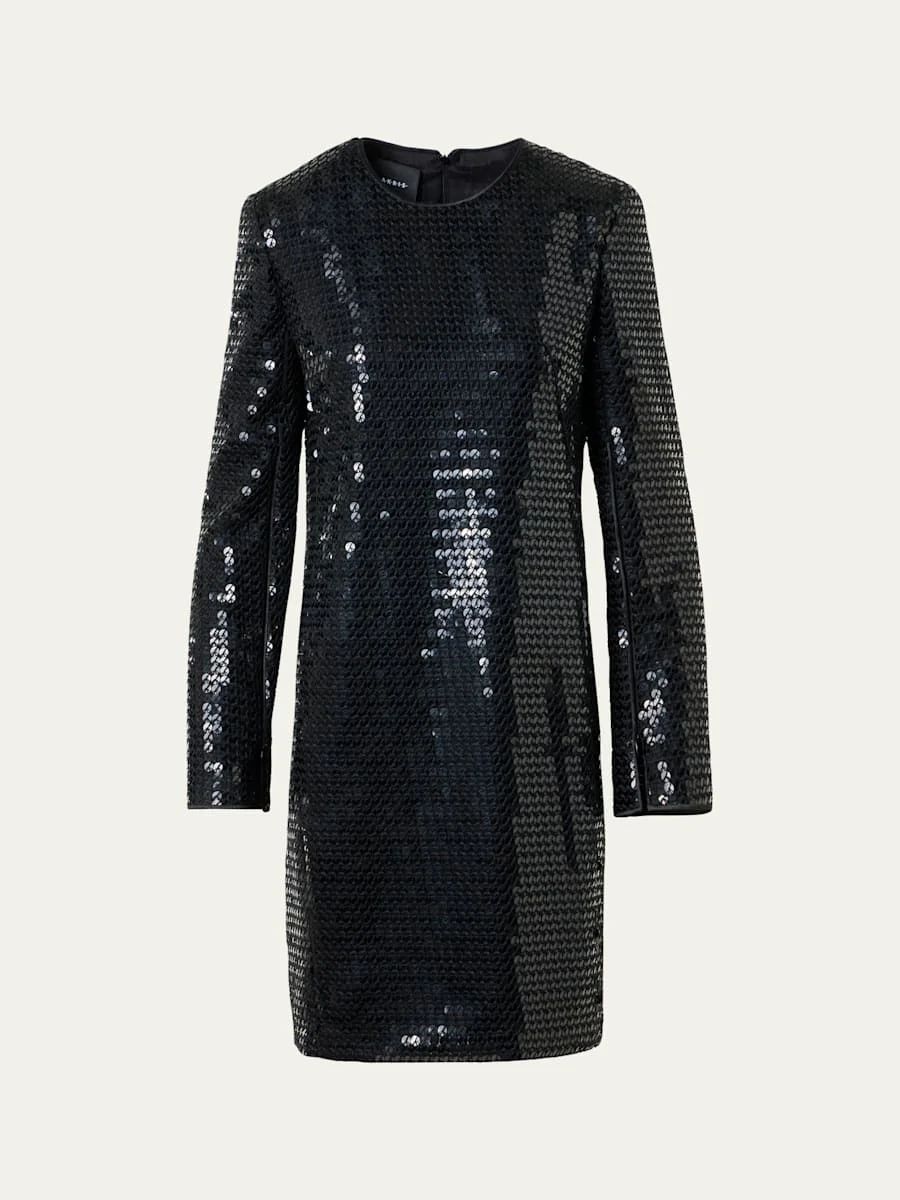 Akris evening dress shimmers in corded fabric encrusted with micro sequins Round neckline Long zip sleeves Hem falls above the knee Shift silhouette Concealed back zip closure Polyester Made in Romania