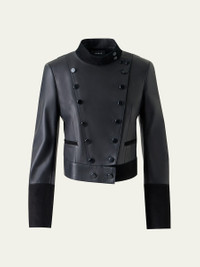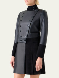 Akris "Dean" jacket crafted from nappa lambskin leather with supple suede trim Stand collar; double-breasted front Long sleeves; zip cuffs Hip welt pockets Fitted Hip length Leather Lining: Silk Dry clean Made in Switzerland Online Inquiries: BGS21_BA281| Store Inquiries: #5019859