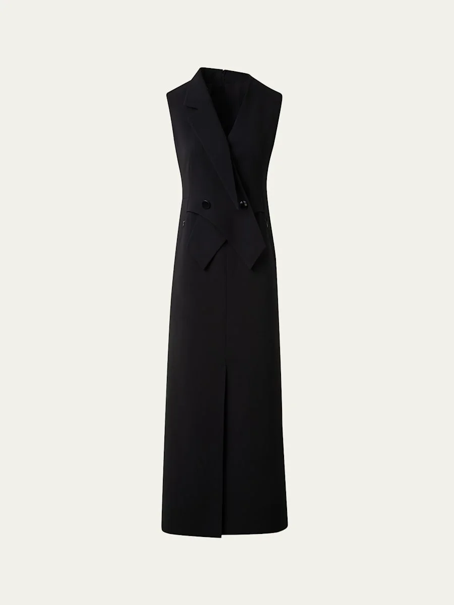 Akris dress crafted from double-face wool with a front gilet effect V neckline Sleeveless Side seam pockets Center-cut front slit Hem falls below the knee Sheath silhouette Invisible back zipper Wool/nylon/polyamide Dry clean Made in Switzerland Online Inquiries: BGS21_B9JZJ| Store Inquiries: #4888077