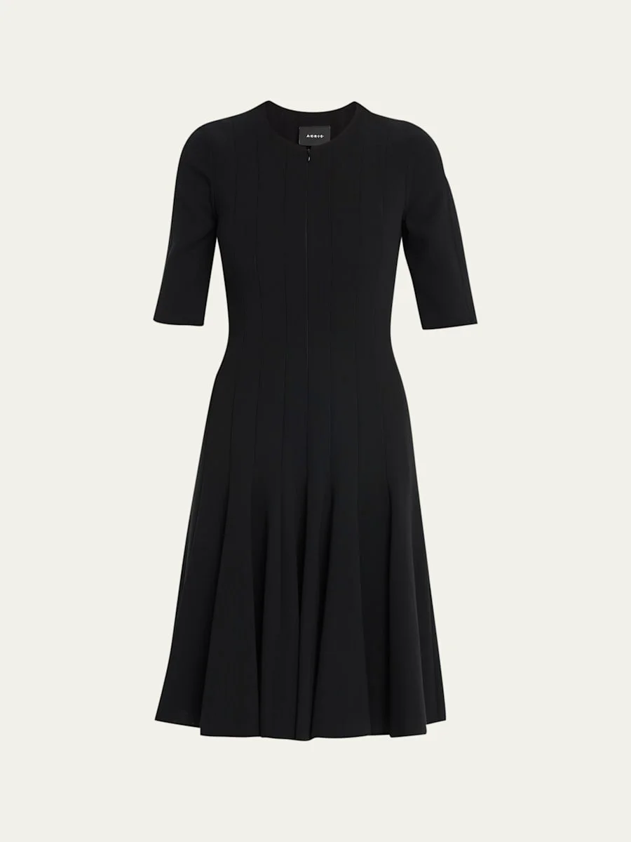 Akris dress in double-face wool blend. Round neckline; zip front. Elbow sleeves. Nips in at natural waist. Gently pleated skirt. Wool/nylon. Viscose lining. Imported. Model is 5'10"/177cm. Online Inquiries: BGS21_TT0MJ| Store Inquiries: #1892417