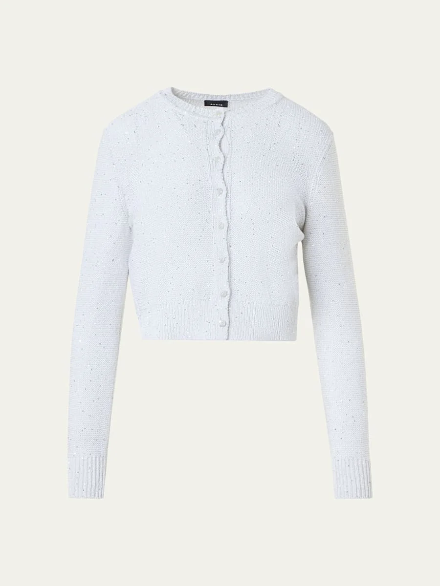 Akris knit cardigan accented with sequins for a subtle spark Crew neckline; button front with scalloped placket Long sleeves Cropped hem Slim fit Linen/polyester/cotton Made in Romania