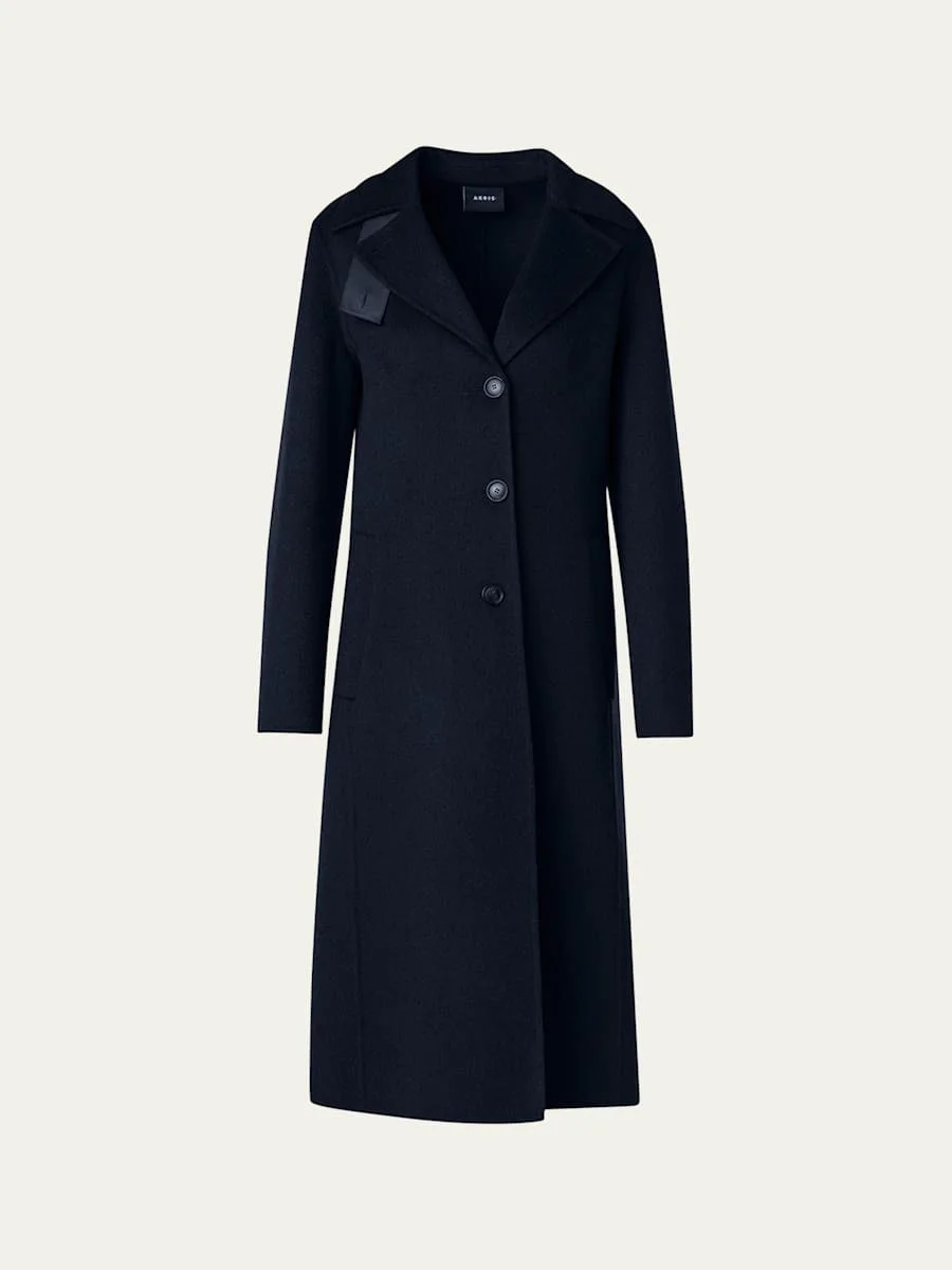 Akris double face blazer coat with goatskin leather collar detail Stand collar; button front Long sleeves Side seam pockets Tailored fit Mid calf length Cashmere Cupro lining Dry clean, professional cleaning recommended Made in Switzerland Model is 5'10"/177cm. Online Inquiries: BGS21_B8KJQ| Store Inquiries: #4587211