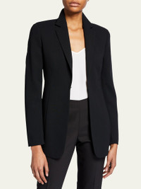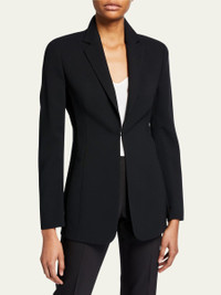 Akris "Odette" jacket in double face wool crepe. Notched lapel; hook front. Long sleeves. Slim, fitted silhouette. Mid thigh length. Cutaway hem. Wool/nylon. Made in Switzerland. Model is 5'10"/177cm. Online Inquiries: BGS21_B6TKN| Store Inquiries: #2704208