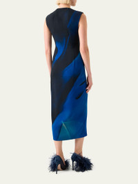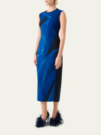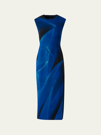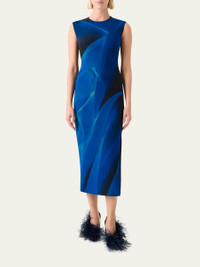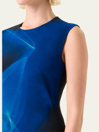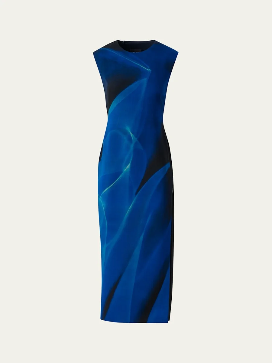 Akris doubleface wool midi dress featuring an Alysons Cyanotype print Crew neckline Sleeveless Sheath silhouette Side slit hem Back zip Virgin wool/silk Lining: Viscose/silk Dry clean Imported