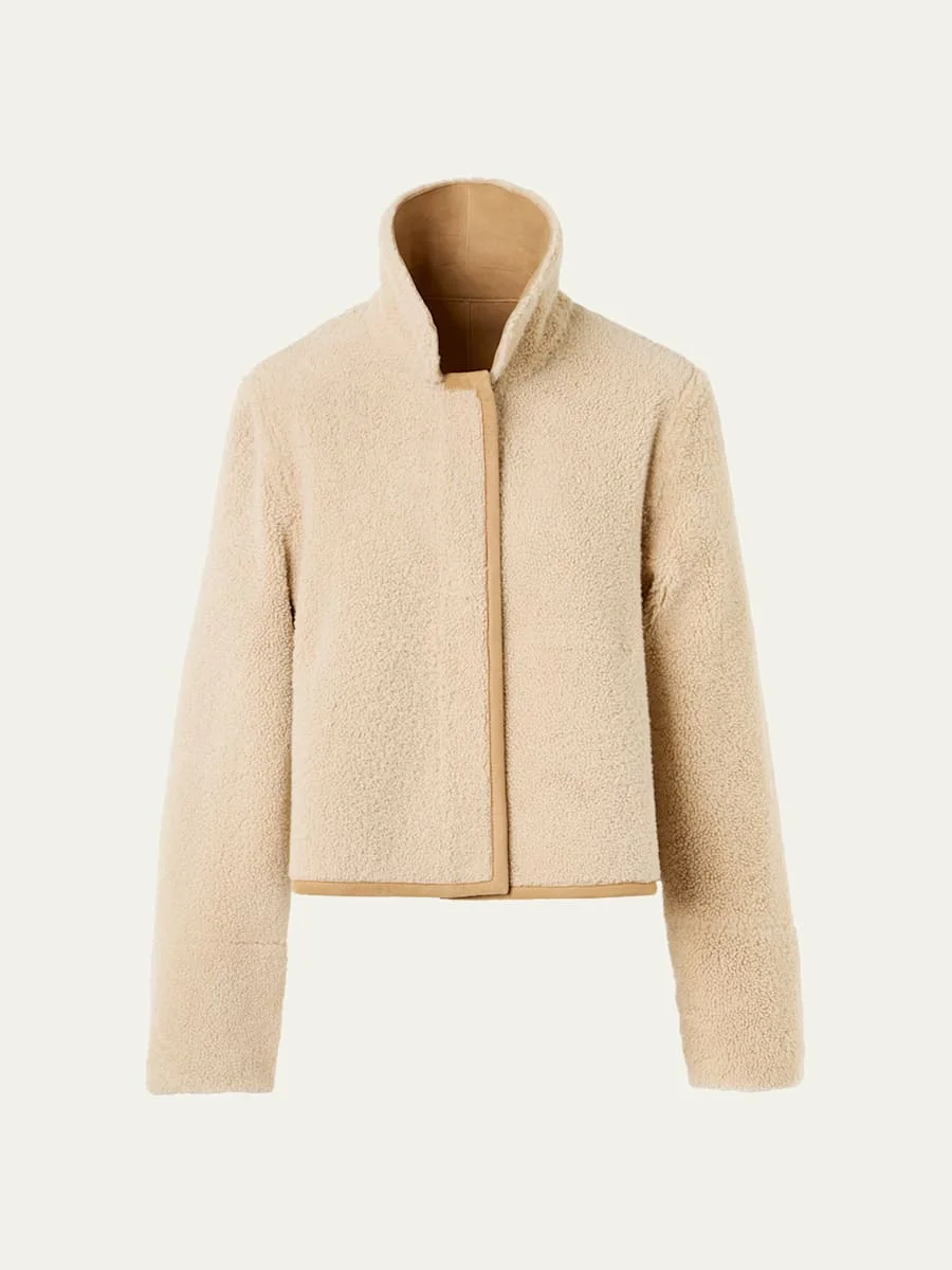 Akris cady short jacket reverses to plush dyed sheep shearling (Turkey) for a dual appeal Styled with the cady side forward, this jacket complements wide-leg work pants, reverse to the beige shearling side for a relaxed denim pairing Spread collar; hidden magnetic closure Long sleeves Kangaroo pockets Boxy silhouette Hip length Shearling Made in Romania Online Inquiries: BGS21_BAT4T| Store Inquiries: #5263629