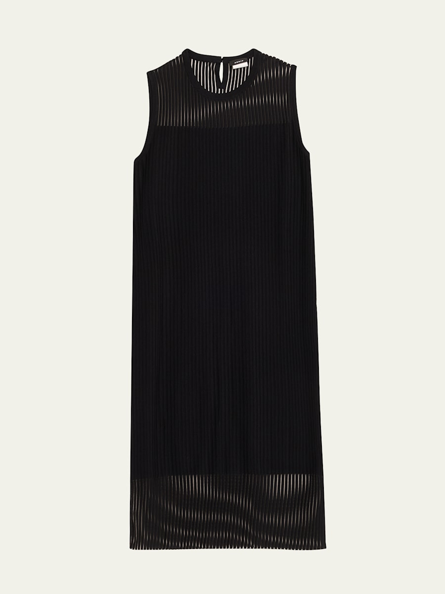 Akris sheer knit dress featuring structured line intarsia with sheer shoulders and hem Round neckline; button back Sleeveless Shift silhouette Knee length Slipover style Silk/cotton/nylon/polyamide Dry clean Made in Romania