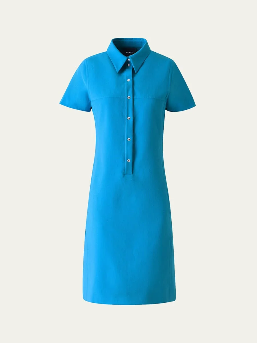 Akris polo dress is crafted of cotton silk stretch doubleface featuring paneling detail and silvertone hardware Point collar; half snapbutton front Short sleeves Side split pockets Shift silhouette Knee length Slipover style Cotton/silk/elastane Lining: Viscose/elastane Dry clean Made in Switzerland