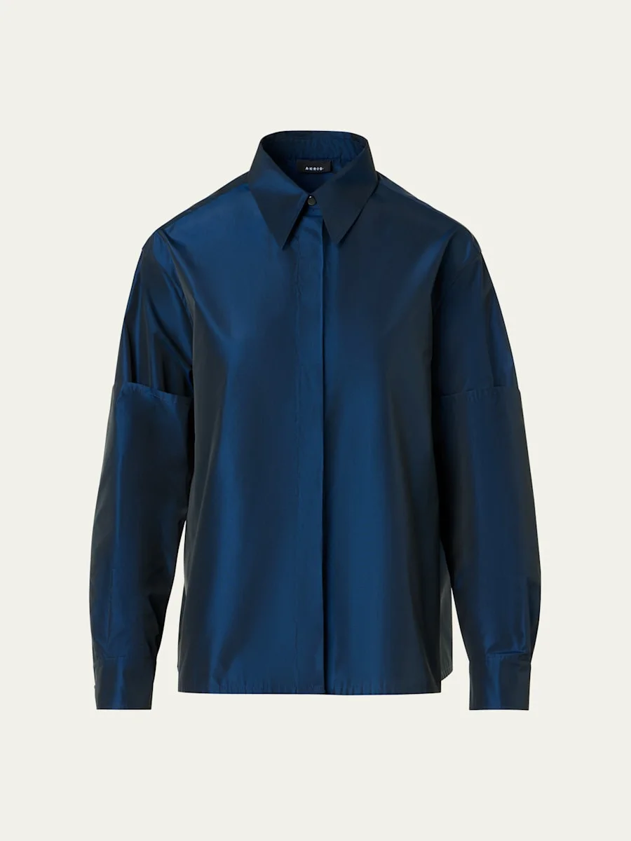 Rendered in silk taffeta, the Akris blouse features a dropped sleeve detail that adds to its architectural silhouette. Point collar Long sleeves with button cuffs Dropped shoulders Yoked back Self-covered button front Straight hem Relaxed fit Silk Dry clean Made in Romania Online Inquiries: BGS21_BA4P9| Store Inquiries: #5035699