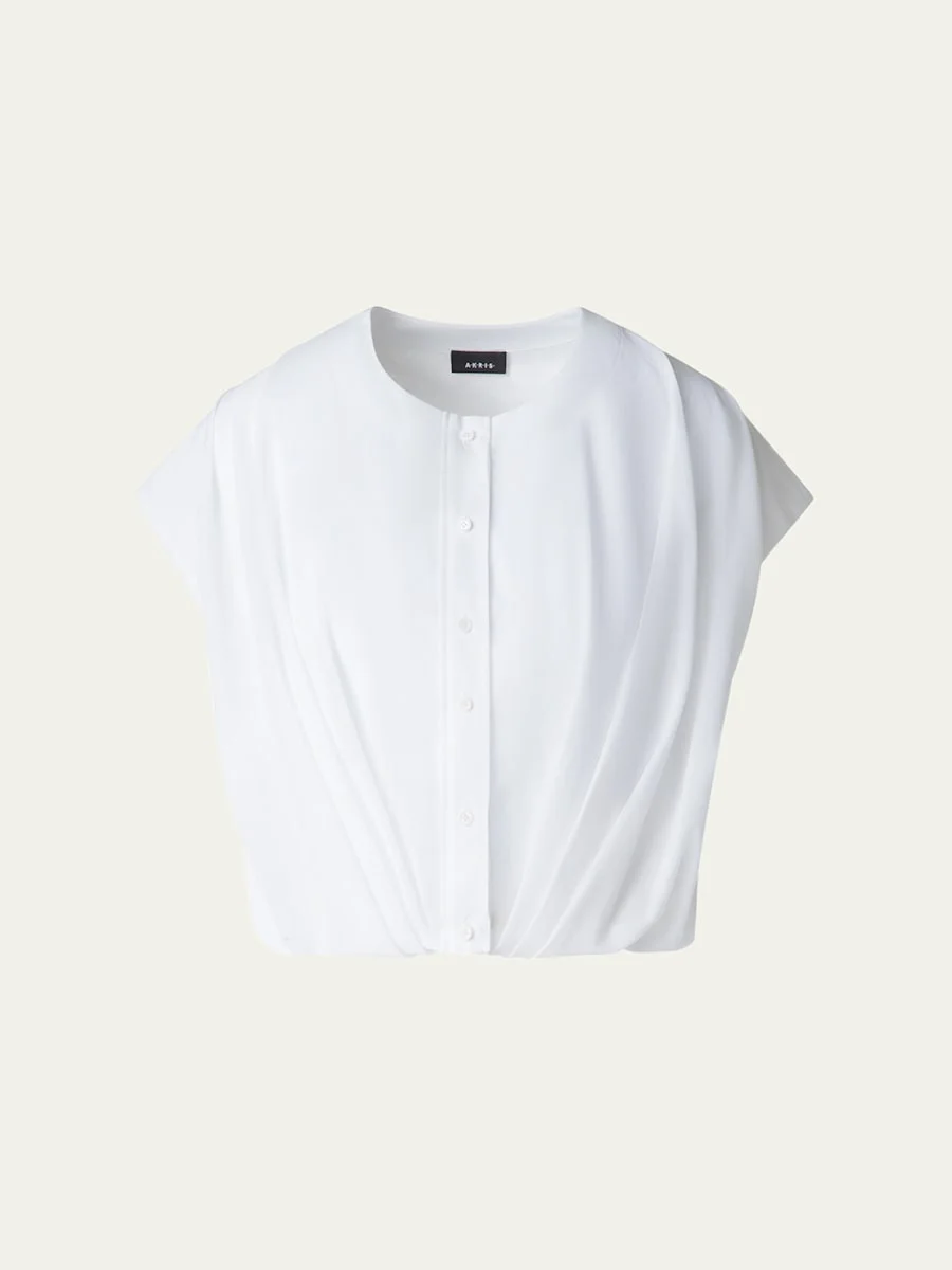 Akris cotton voile blouse featuring hem pleats creating a bubble hem Crew neckline; button front Sleeveless Loose fit Cotton Dry clean Made in Switzerland Online Inquiries: BGS21_B9JZ1| Store Inquiries: #4888059